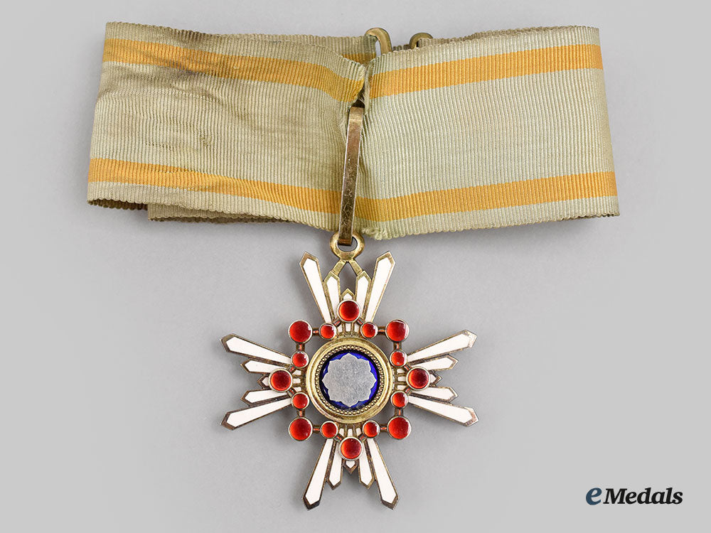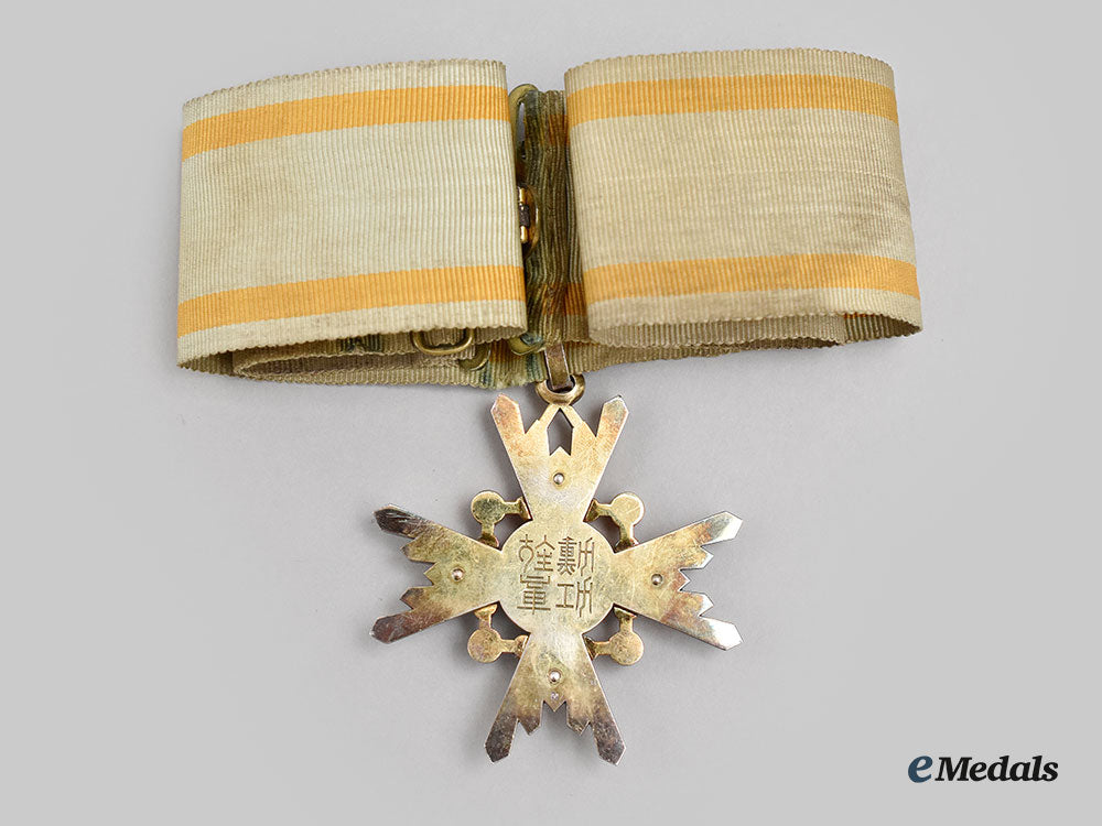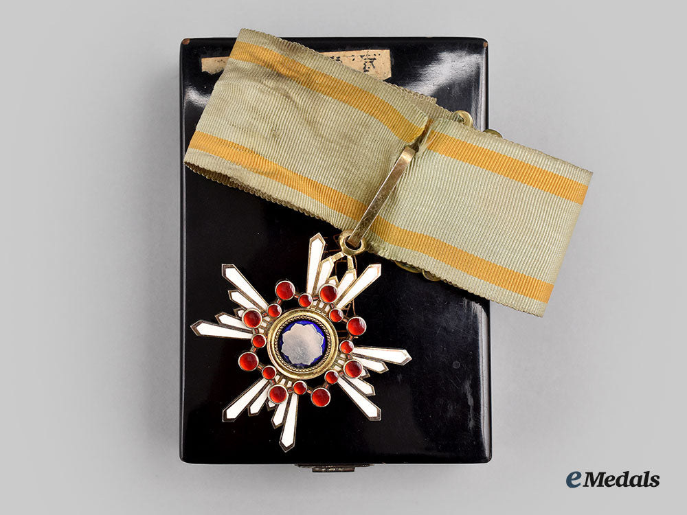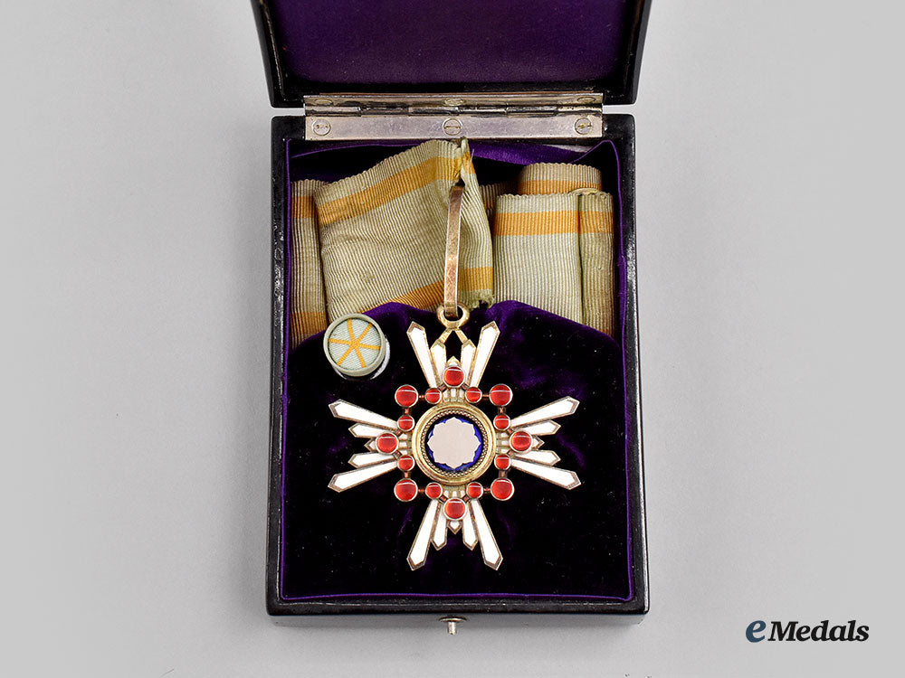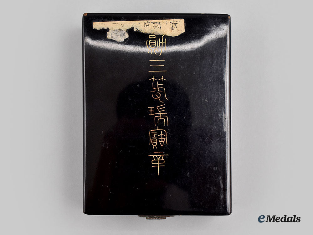 (Zuihōshō, 瑞宝章). Instituted in 1888. Multi-piece construction, in silver with white and blue enamels, along with sixteen red glass cabochons, measuring 52.5 mm (w) x 57 mm (h) inclusive of its integral ring, intact enamels, very light contact, on its original full-length neck ribbon with bronze gilt clasp closure, the ribbon exhibiting a slight tear at the junction with the loop, near extremely fine. Accompanied by its Award Document with handwritten Japanese text in black ink, with an official stamp in red ink overlaying the text, along with an independent piece of paper inscribed with various translations, in its hardshelled case of issue, balsa wood frame, the exterior with a black lacquer finish, gilt characters on the lid, inside lid lined in violet satin and padded, base with a platform in violet felt and recessed, measuring 79.5 mm (w) x 109 mm (h) x 35 mm (d), Japanese label stub affixed to the lid, scuffing and tiny chipping evident on the bottom, case better than very fine.