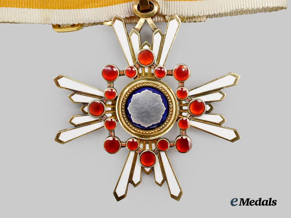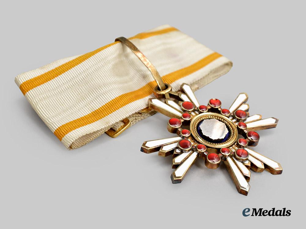 Instituted in 1888. Four-point star in white enamel with sixteen ruby red cabochons, obverse centre shows a silver flower superimposed on blue enamel, on original striped ribbon, 52 mm, near mint condition. Housed in original case, very fine condition.