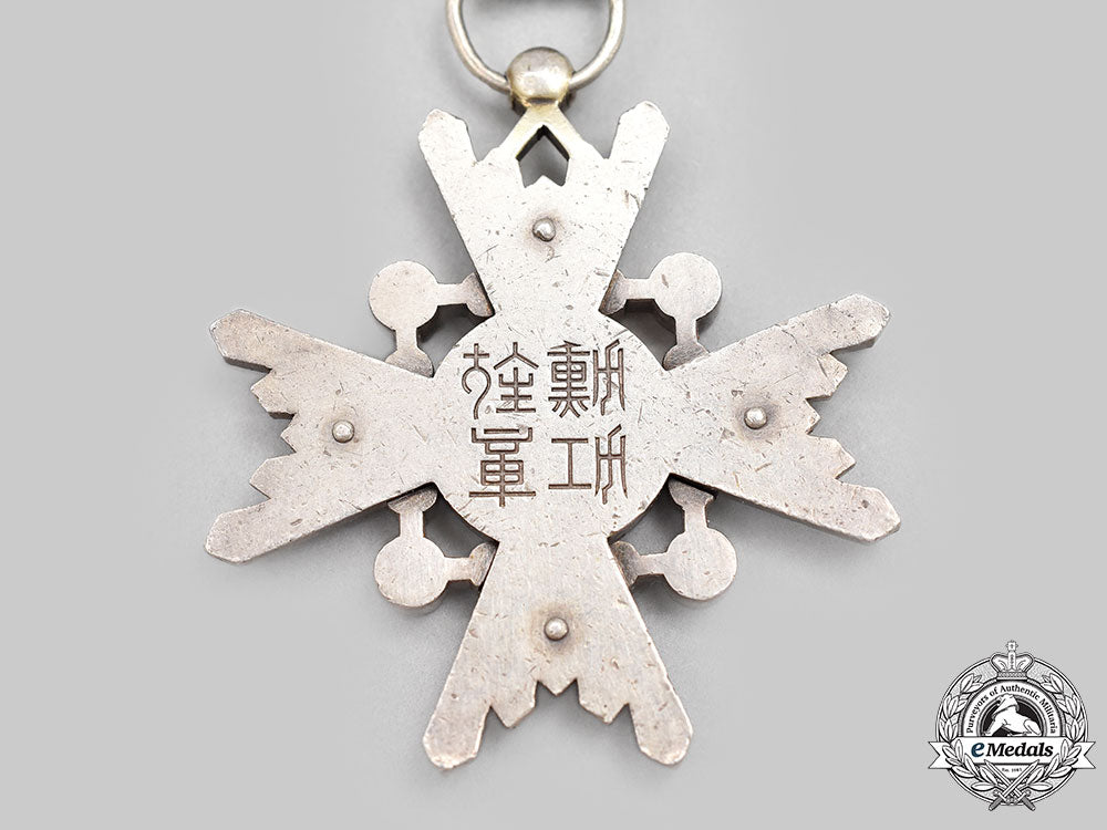 (瑞宝章, Zuihōshō). Instituted in 1888. Multi-piece construction, in silver with white and blue enamels, along with sixteen red glass cabochons, measuring 43 mm (w) x 48 mm (h) inclusive of its laterally-pierced ball suspension, repair evident in the red glass cabochons in multiple locations, crazing evident in the white enamels on some of the rays on three of the four arms, lightly soiled original triangular ribbon with hook and eye, near very fine.
