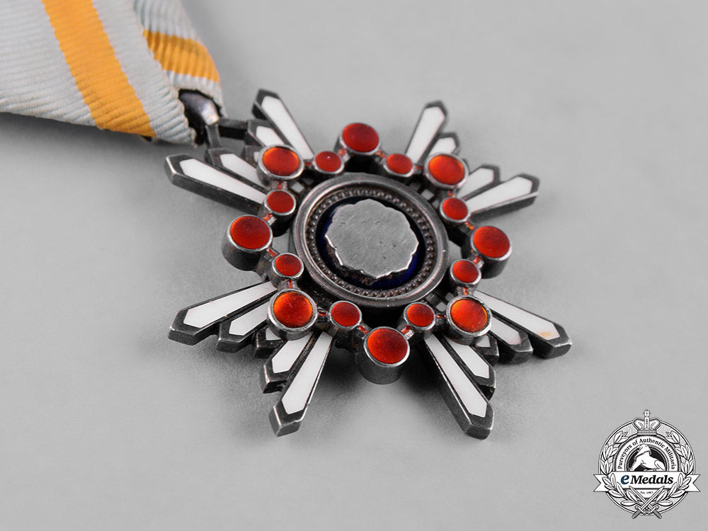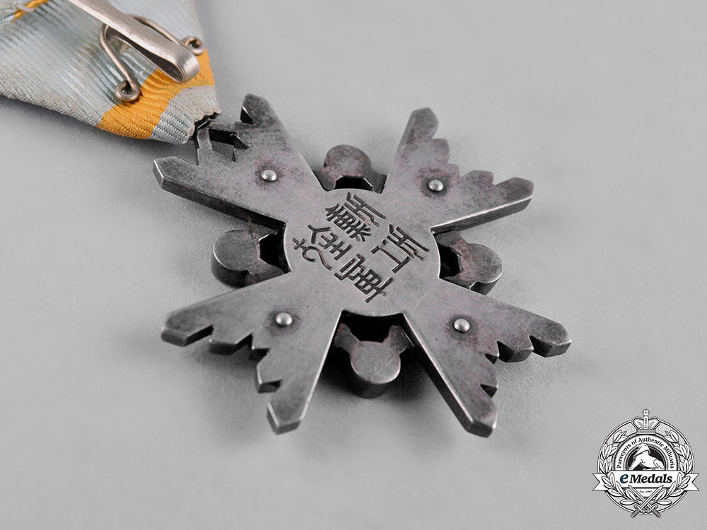 (瑞宝章). Instituted in 1888 by Emperor Meiji. 1888-2003 issue. Constructed of silver, a fine enameled white four-armed cross, featuring clusters of five silver-framed rays in each arm, the obverse exhibiting a central silver Yata Mirror, legendary Japanese symbol of purity, on an enameled deep blue background, surrounded by 16 connected red cabochon glasses of different sizes, representing the legendary Yasakani jewels, plain reverse nicely engraved by Order’s Japanese characters, measuring 37.74 mm (w) x 43.32 mm (h - inclusive of ball suspension), light contact, suspended by original triangular class ribbon with hook and eye, extremely fine condition.