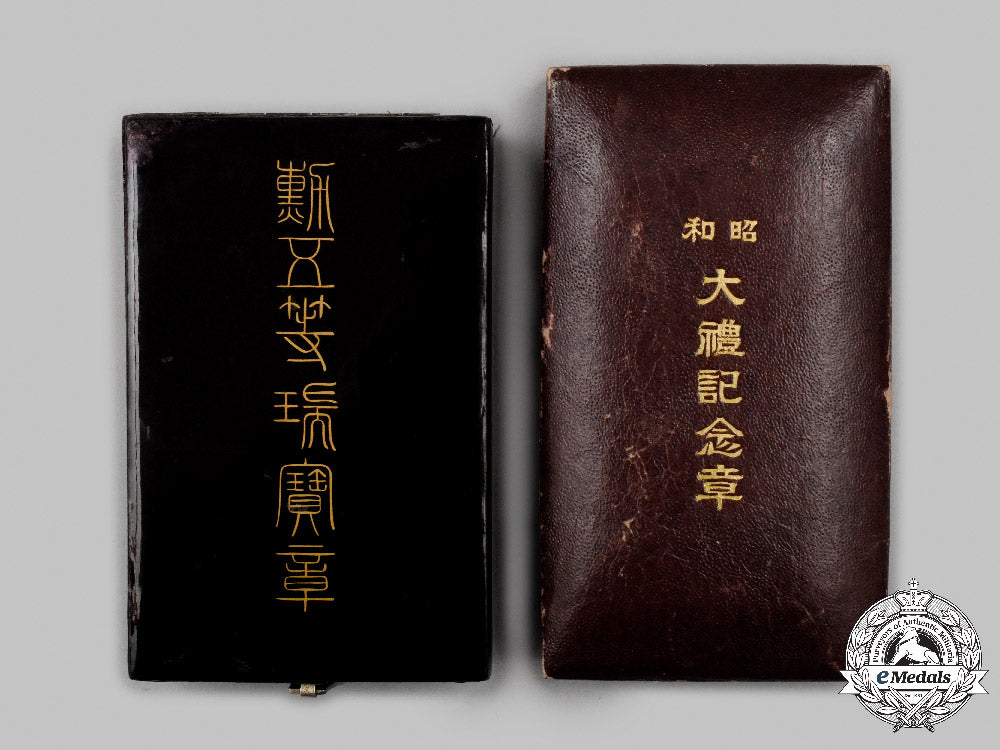 3. Showa Enthronement Commemorative Medal 1928 (昭和天皇即位記念メダル, Shōwadenkō sokui kinen medaru). Instituted in 1928 (in silver with a gilt chrysanthemum, measuring 30.3 mm in diameter, exhibiting tarnish spots, original ribbon with hook and eye, in its hardshelled case of issue, lightly soiled white felt recessed medal bed, case measuring 59 mm (w) x 106 mm (h) x 22 mm (d), scuffing evident on the exterior).