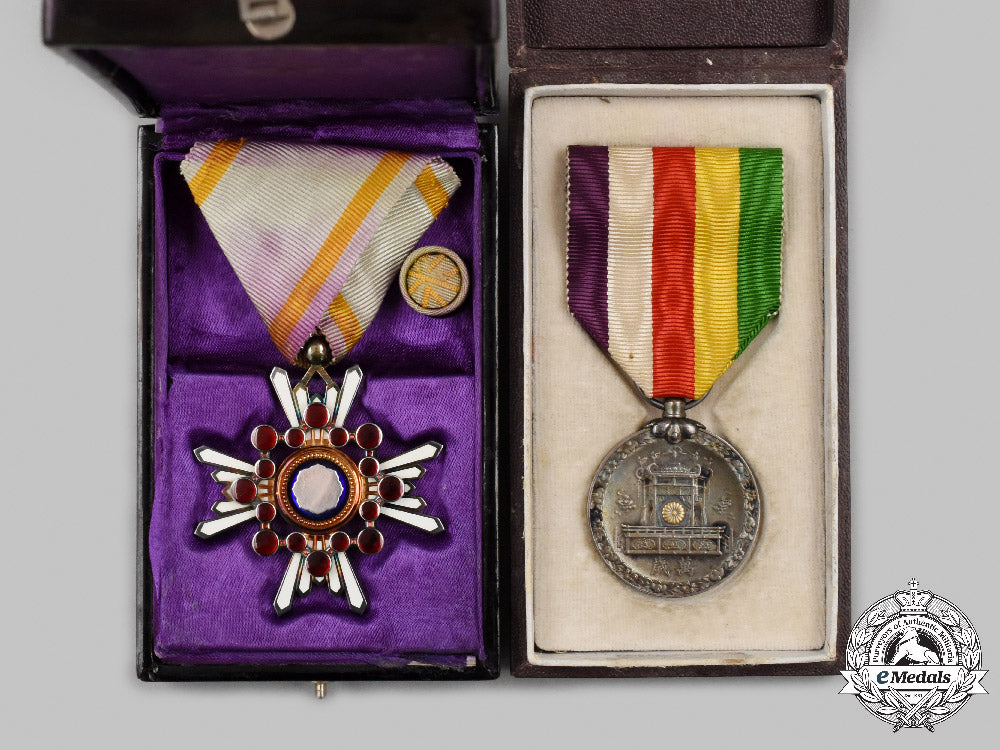 1. Order of the Sacred Treasure, V Class (瑞宝章, Zuihōshō). Instituted in 1888 (multi-piece construction, in silver gilt with white and blue enamels, along with sixteen red glass cabochons, measuring 43.2 mm (w) x 48.3 mm (h) inclusive of its laterally-pierced ball suspension, intact enamels and cabochons, discoloured original triangular ribbon with hook and eye, accompanied by its 12 mm in diameter rosette, in their hardshelled case of issue, balsa wood frame, black lacquer finish, gilt characters on the lid, inside lid and medal bed lined in violet satin, the medal bed recessed into a raised platform, case measuring 63 mm (w) x 96 mm (h) x 25.5 mm (h), chipping and loss evident in the black lacquer finish on three sides of the lid).