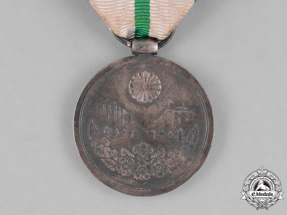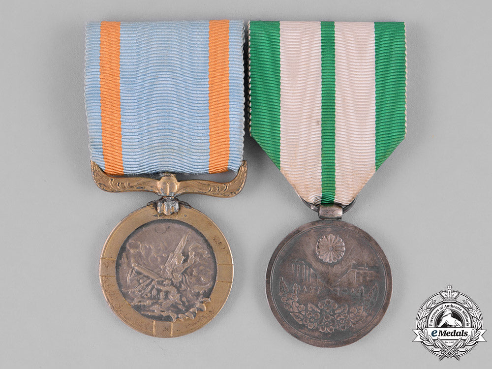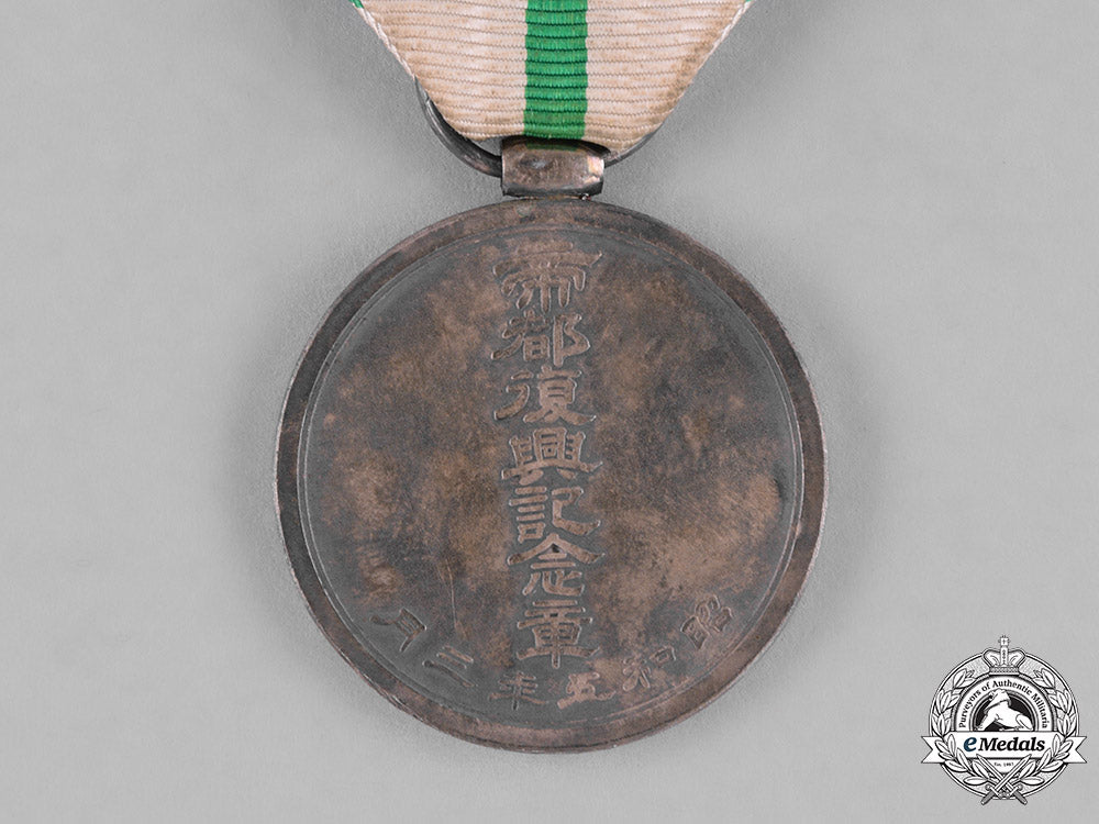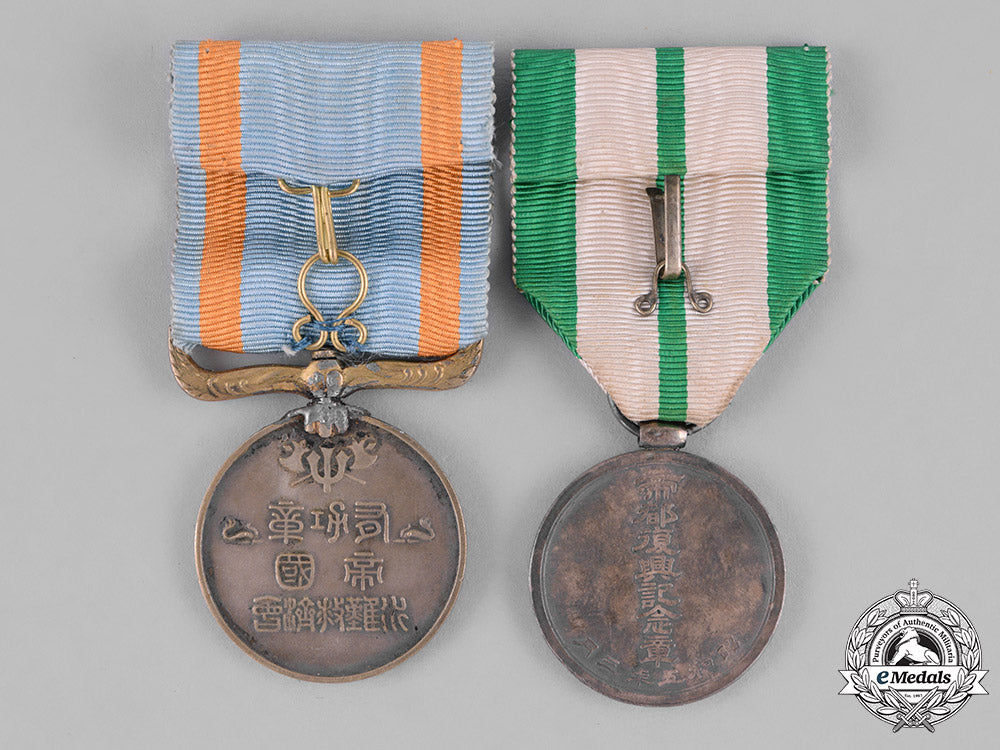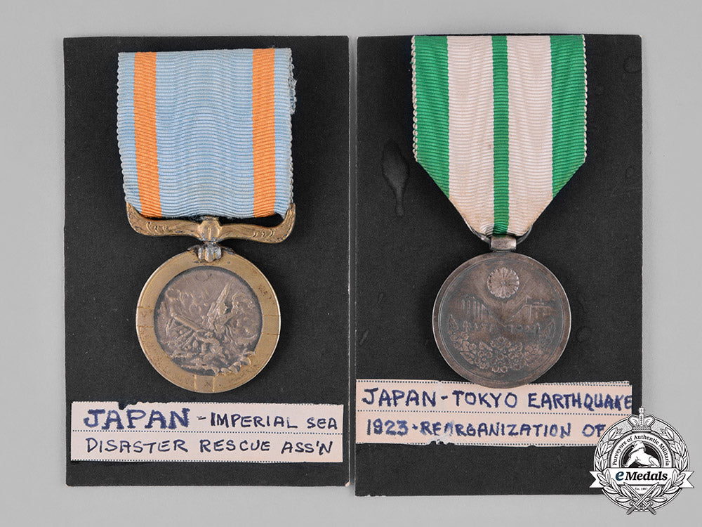 Capital Rehabilitation Commemorative Medal: instituted in 1930, in silver, measuring 30 mm in diameter, original ribbon with hook and eye; and Imperial Sea Disaster Rescue Society Merit Medal: in silver gilt, measuring 31.8 mm in diameter, original ribbon with hook and eye. Very fine.