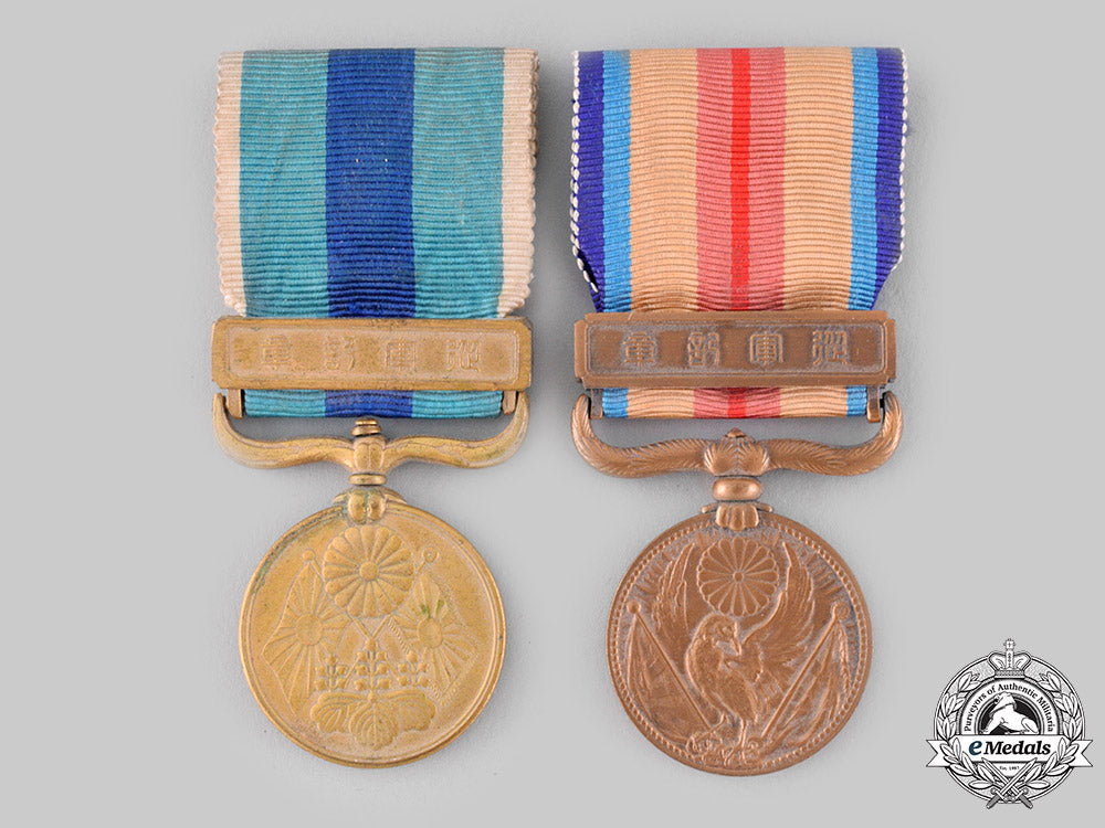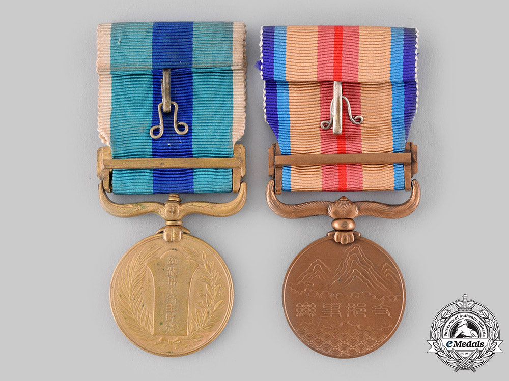 1904-1905 Russo-Japanese War Medal (instituted in 1906, in bronze gilt, measuring 30.5 mm in diameter, spotting, edge nicks, original ribbon with hook and eye); and China Incident War Medal (instituted in 1939, in bronze, measuring 30 mm in diameter, spotting, original ribbon with hook and eye). Near extremely fine.