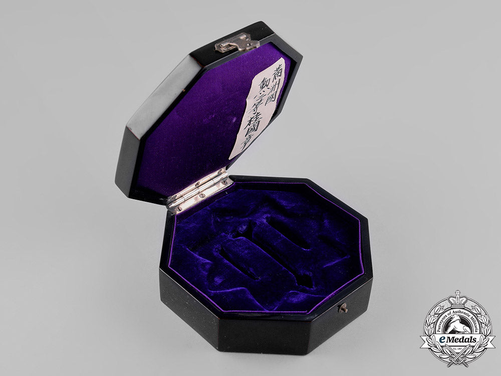 A presentation case for a Grand Cordon Breast Star of the Order of the Rising Sun, constructed of a balsa wood frame with a black lacquered finish, the obverse lid with gilt Japanese characters, the interior with a purple satin-type lid liner bearing a manufacturer’s label, with a slotted purple doeskin medal bed, opening with a functional silvered bronze snap button and functional hinge of identical construction, measuring 106 mm (w) x 107 mm (l) x 38 mm (h), in better than very fine condition.