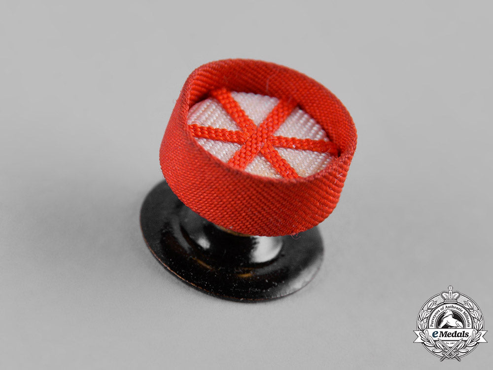 A presentation case for a IV Class Badge of the Order of the Rising Sun, constructed of a balsa wood frame with a black lacquered finish, the obverse lid with gilt Japanese characters, the interior with a purple satin-type lid liner, with a depressed purple doeskin medal bed, opening with a functional silvered bronze snap button and functional hinge of identical construction, unmarked, measuring 65 mm (w) x 130 mm (l) x 30 mm (h), accompanied by a period original boutonniere, measuring 12 mm in diameter, the left lid of the case demonstrates some cracking of the wood, otherwise in very fine condition.