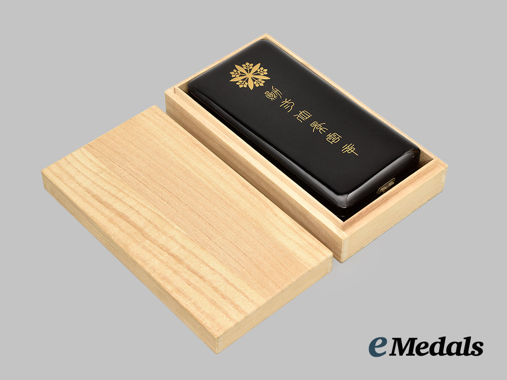 The set is contained in its original case of issue, a black lacquered exterior with the lid marked with characters and a orchid blossom, the interior with a purple silk lid and recessed purple velvet medal bed, the top half presents a storage compartment for the neck ribbon, measures 118 mm (w) x 235 mm (l) x 45 mm (d), light wear to exterior and interior, hinge and clasp functional, a lovely case in near extremely fine condition.