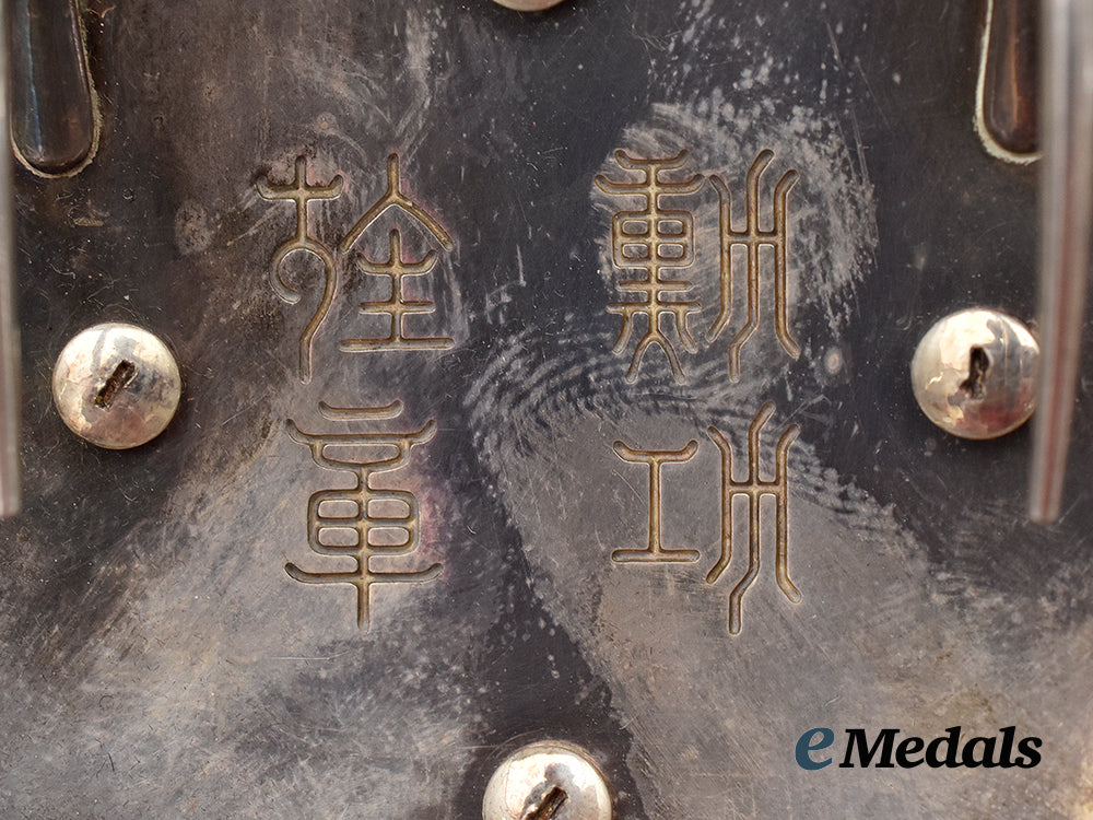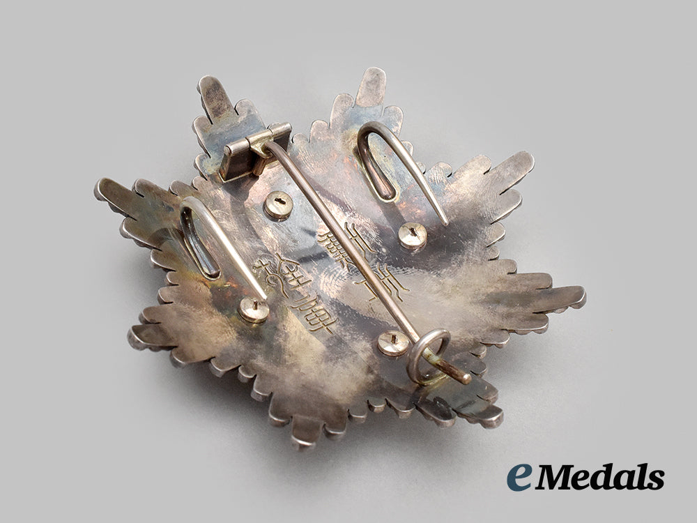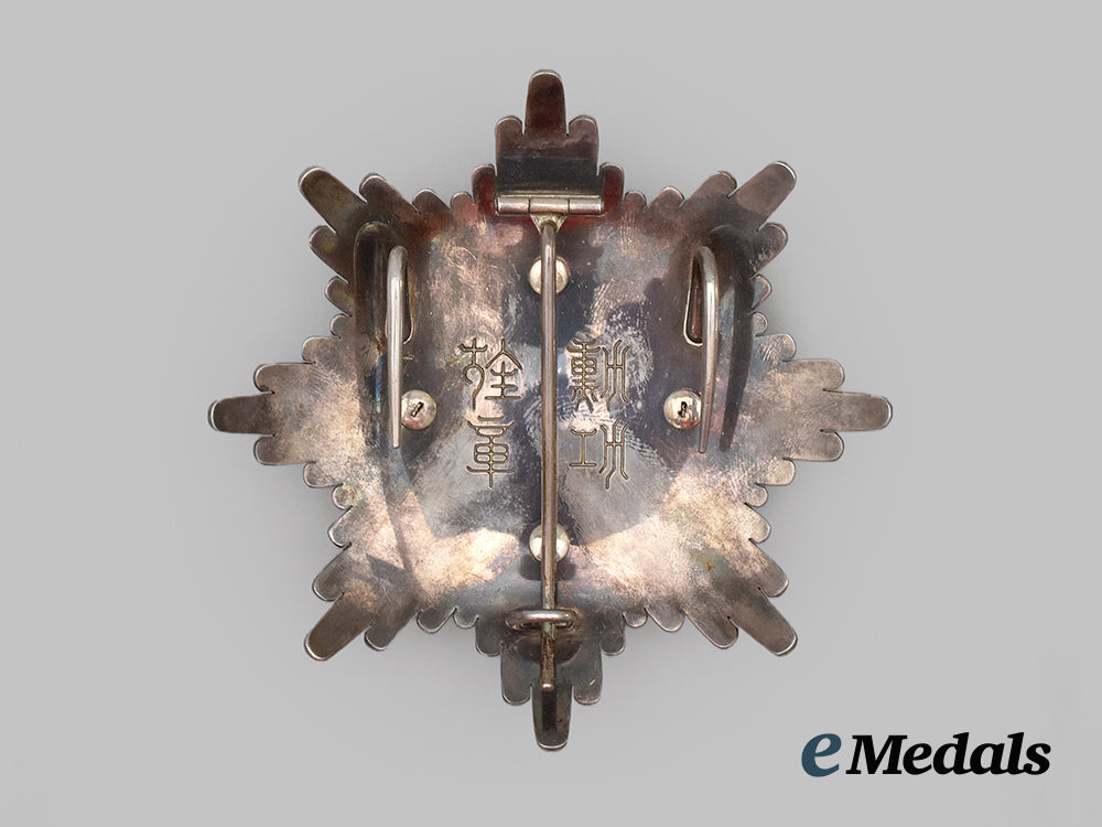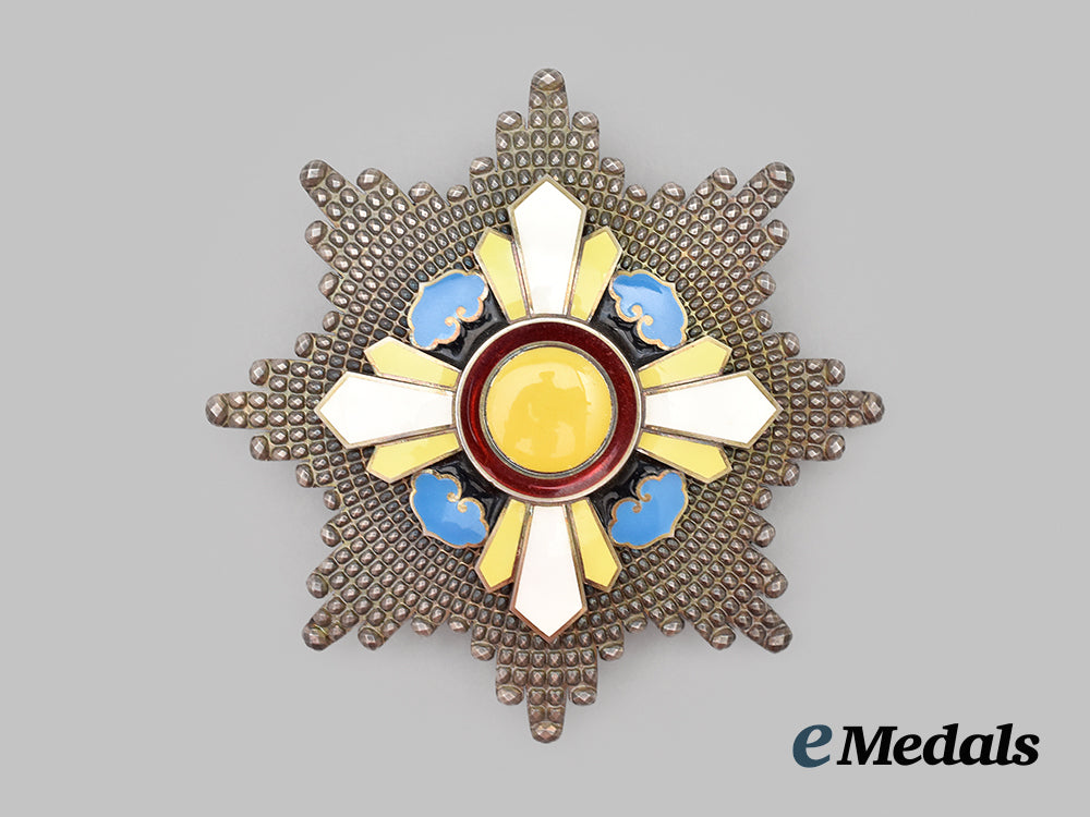 The Star of the Set, in silver, an eight point star with clusters of faceted rays, with the enamelled insignia in the center representing a four point star with clusters of three rays, the central enamelled in white with each flanking ray in yellow, between each cluster of rays sits a blue enamelled cloud and the space below enamelled in black, the obverse medallion with a central yellow field encircled by a red ring, the reverse presents four rivets and central engraved characters translating to “Order of Merit Decoration”, offering a vertical pin and dual stay assembly, the star measures 90.45 mm (w) x 90.10 mm (h), weighs 75.4 grams, enamels intact, central yellow medallion slightly loose, catch and hinge functional, remains in extremely fine condition.