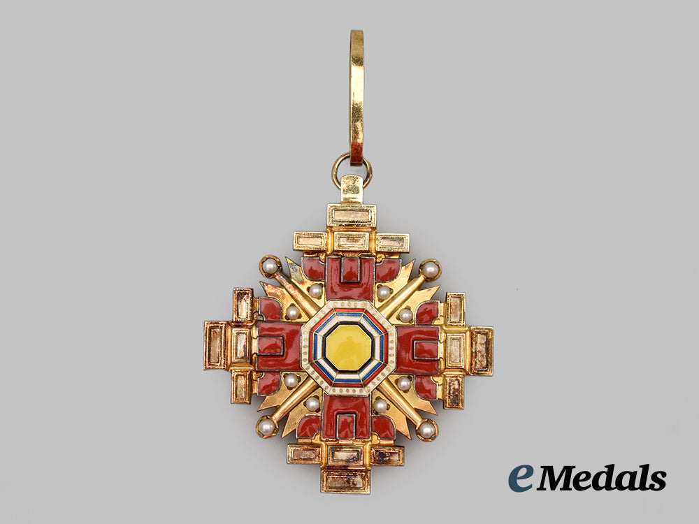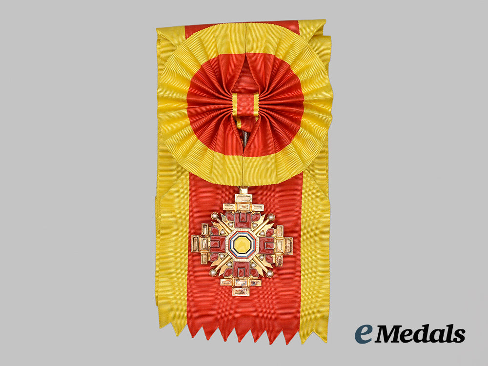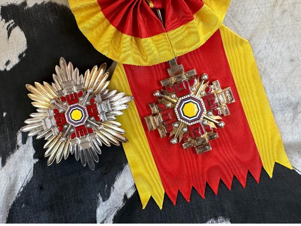 (国家支柱勋章 / Guójiā zhīzhù xūnzhāng / 柱国章). Instituted September 14 1936. A rare and near mint Grand Cordon of the Order of the Pillars of State, comprising a sash badge, in silver gilt, featuring a four armed cross with four blocks on each tip, the base of the arms in red enamels, the space in each quadrant offers a silver gilt ray with a pearl at the tip, two other rays are present on each edge and feature a pearl on each side, all pearls are held with by three small claws, the obverse medallion sits a yellow enamelled octagonal pillar bordered by concentric bands of the other national colours including black, white, blue and red, with an outer ring of white with silver gilt dots, the reverse of the badge is plain with the engraved characters translating to “Order of Merit Decoration”, the badge measures 62.87mm (w) x 69.15mm (h – inclusive of suspension), weighs 98.3 grams, enamels intact, light wear of the gilt, a beautiful decoration in near mint condition. Accompanied by a full length red and yellow watered silk sash with central rosette and clasp for badge attachment, in near mint condition.