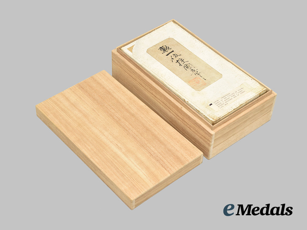 Contained in its original black lacquer case, gilded characters on the exterior, with a purple silk lid and purple velvet recessed medal bed with storage component for sash below, measures 135 mm (w) x 255 mm (l) x 77 mm (d), hinge and clasp functional, minor wear, remains in near mint condition. Accompanied by the original paper packaging and cardboard box with characters on both, a rare addition to an overall near mint Grand Cordon Set.