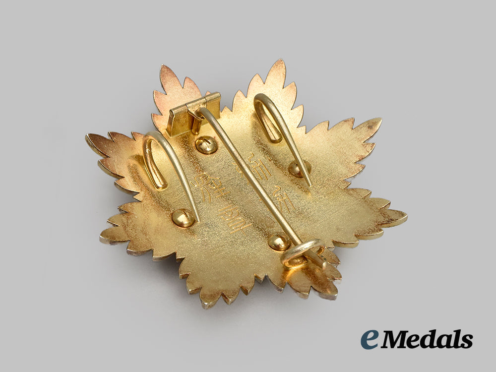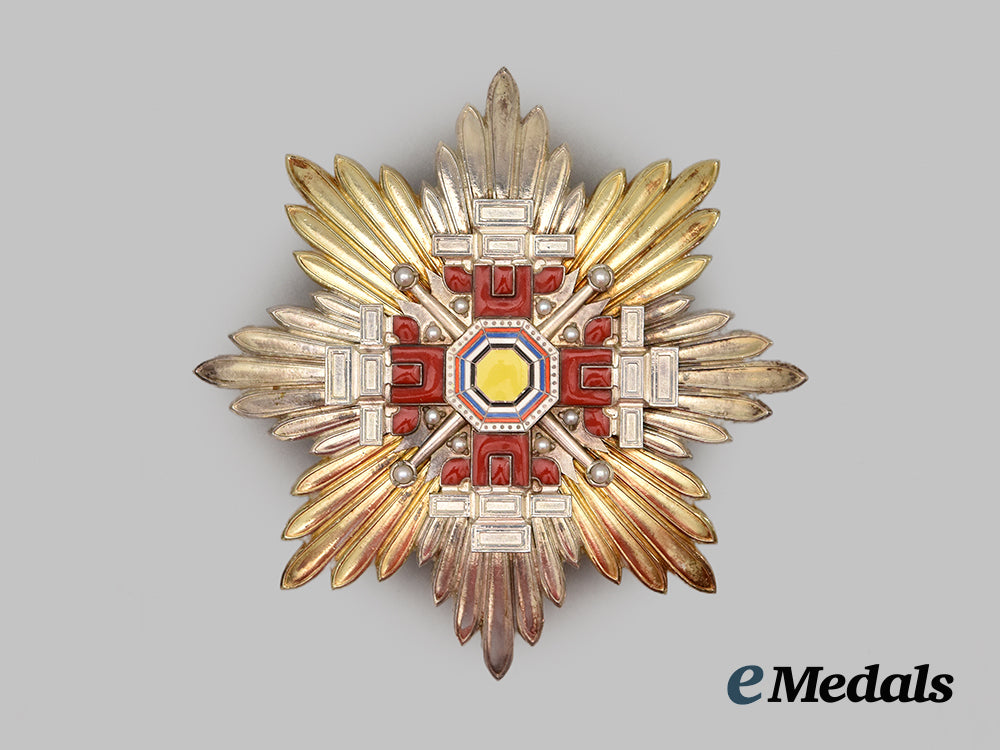 The Star of the Order, an eight point star with alternating clusters of seven of silver and five silver gilt smooth rays, the central medallion matches the insignia of the badge, portraying four red enamelled pillars with four blocks at each tip, with a main silver gilt ray with a pear at the tip in each quadrant with two flanking smooth rays and a central pearl in each, the obverse center features a yellow enamelled octagonal pillar bordered by concentric bands of the other national colours including black, white, blue and red, with an outer ring of white with silver gilt dots, the reverse presents the central engraved “Order of Merit Decoration” characters, with four rivets, and a vertical pin with dual stays assembly, the star measures 81.45mm (w) x 81.05 mm (h), weighs 113.3 grams, enamels intact, minor oxidation to rays, remains in near mint condition.