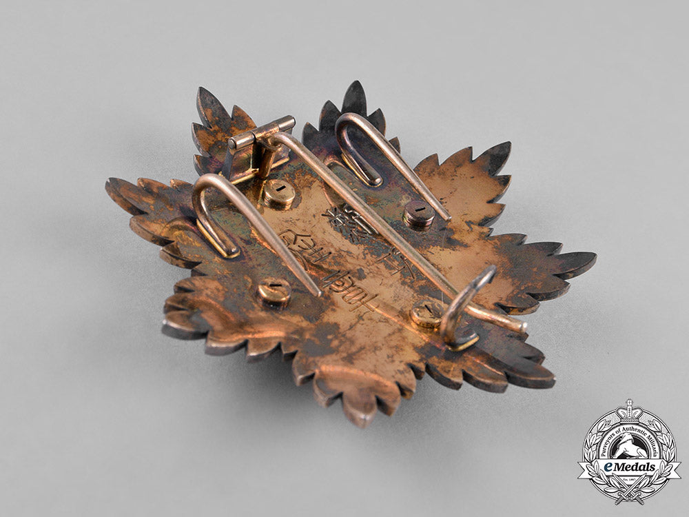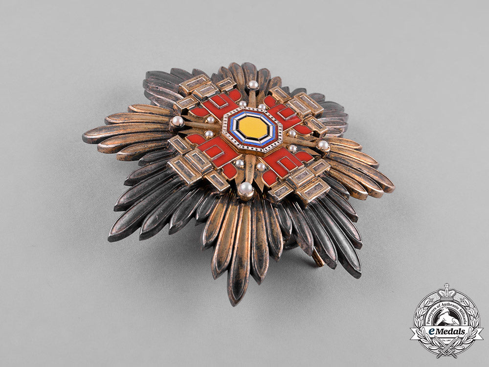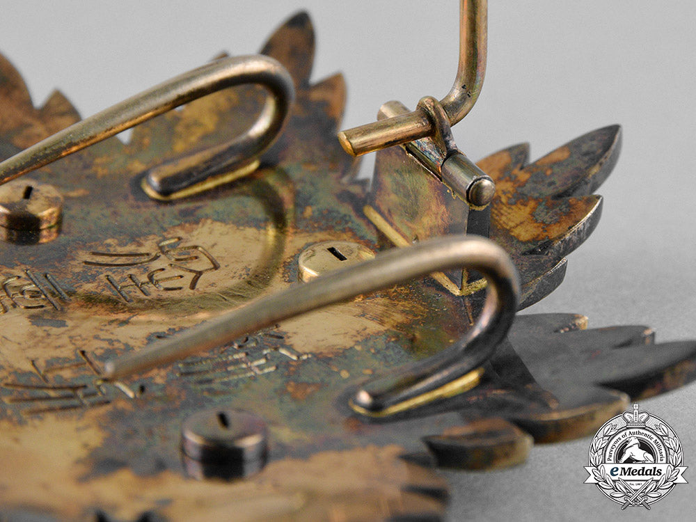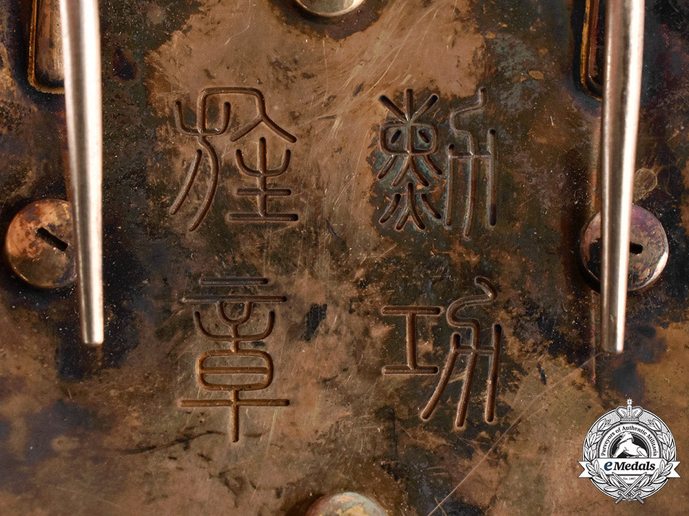 Instituted 1936. An eight point star consisting of clusters of five smooth silver rays between clusters of seven smooth silver gilt rays of increasing lengths, the obverse center bears insignia of the order, four red enamelled pillars with four rectangles at each demonstrating a repeated cross, between each pillar lay twelve inset pearls, two small pearls at each base and one larger pearl at the end of a short smooth ray, the direct center presents a yellow enamelled octagon with thin black, white, blue and red enamel borders, reverse center bears Japanese script, along with four intact screws and a vertical pinback flanked by dual stays, measuring 81mm (w) x 81mm (h), pin loose in clasp, evident gilt wear and slight enamel crack on 3 o’clock pillar, near extremely fine condition.