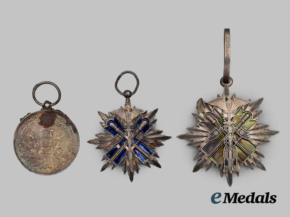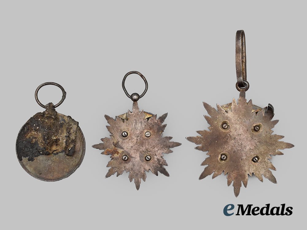 Three medals recovered from an abandoned home in the blast radius of Nagasaki in 1945; one fourth or fifth class Order of the Golden Knite with fire damage, very minimal remaining enamel except for the blue cross, measuring at 45.7mm (w) x 49.0mm (h); one third class Order of the Golden Kite with full discolouration as a result of fire damage measuring at 54.3mm (w) x 60mm (h); and one Occupied Manchukuo Enthronement Commemorative Medal, c.1935, Instituted in 1934. In silver with a gilt insignia, with residue and debris melted onto reverse of medal, measuring 35.3 mm in diameter,.