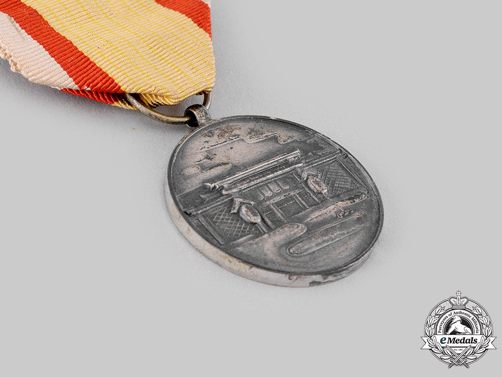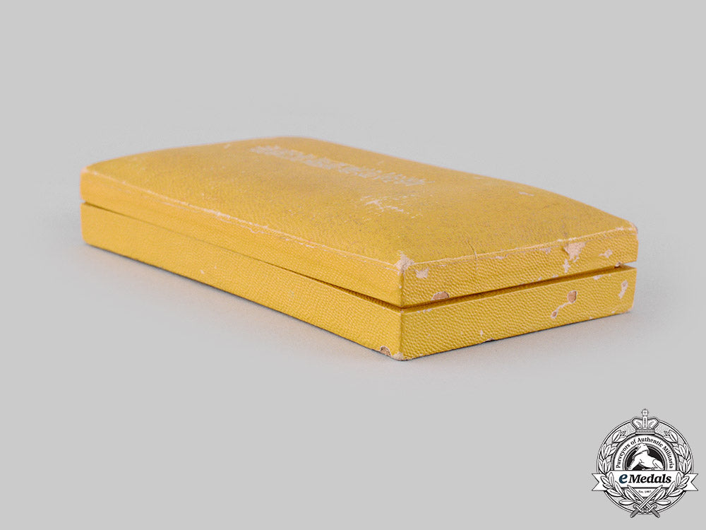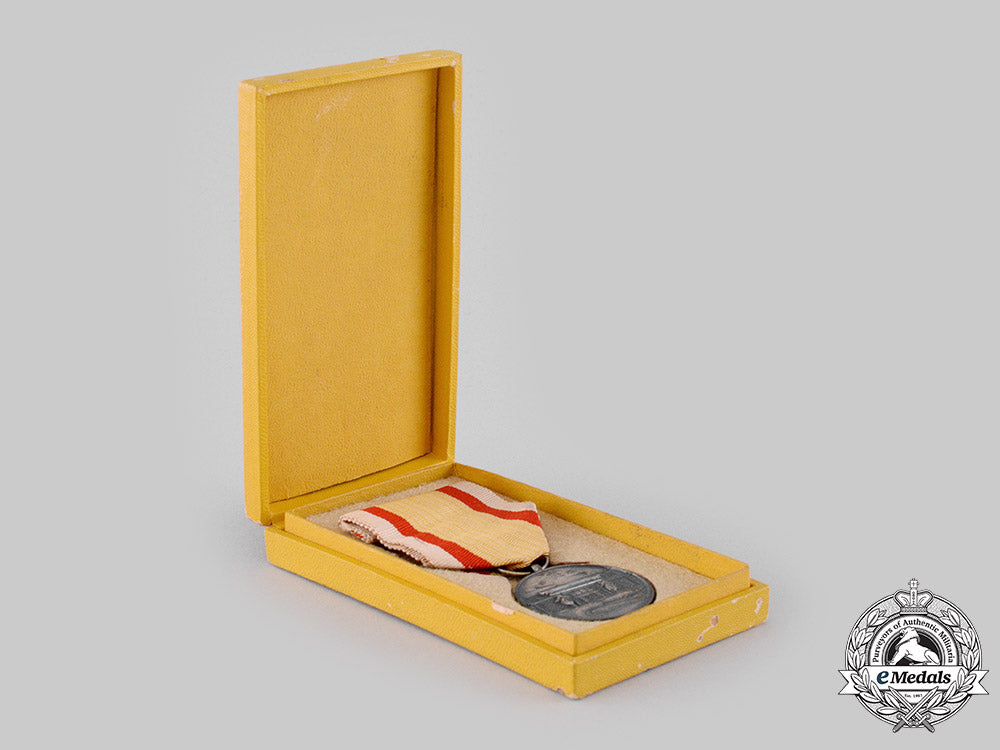 Instituted in 1940. In silvered bronze, measuring 30.5 mm in diameter, edge nicks, scattered silvering wear, original ribbon with hook and eye, near extremely fine. In its hardshelled case of issue, yellow dimpled exterior, silvered characters on the lid, pressed board recessed medal bed, accompanied by an additional shortened ribbon, light scuffing on the exterior, case better than very fine.