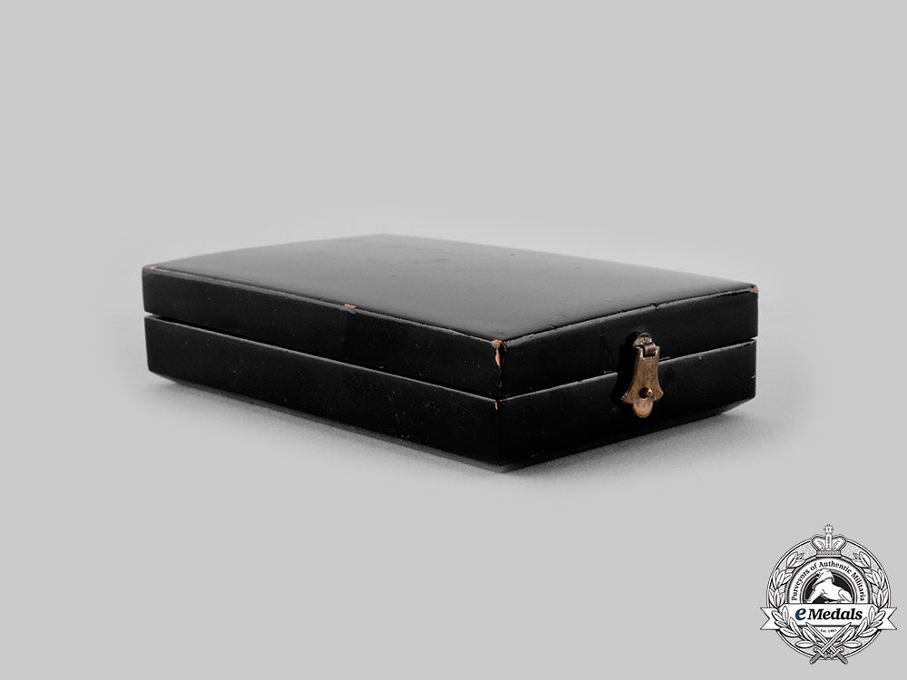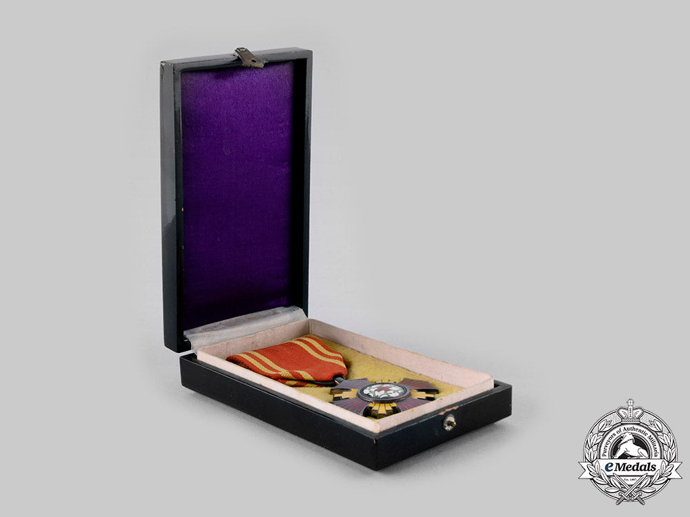 Instituted in 1938. Three-piece construction, in silver with red, white, green and yellow enamels, measuring 44 mm (w) x 49 mm (h) inclusive of its laterally-pierced suspension, chipping evident in the yellow enamels on the rays on either side of the arm at 9 o'clock, crazing present in the red enamels on the arm at 3 o'clock and on the Red Cross on the centrepiece, contact marks, original ribbon with hook and eye, very fine. In its hardshelled case of issue, the exterior with a black lacquer finish, balsa wood frame, gilt characters on the lid, the inside of the lid lined in violet satin and padded, lightly soiled recessed medal bed in yellow felt, wear evident along the edges of the lid on the exterior, case fine.