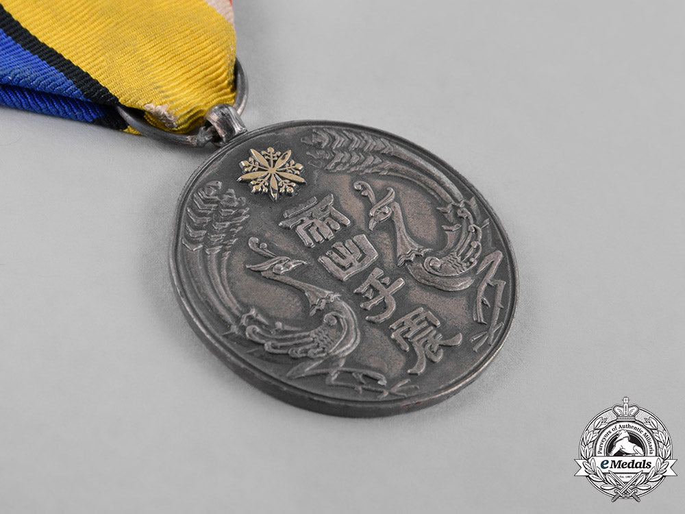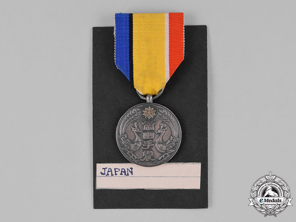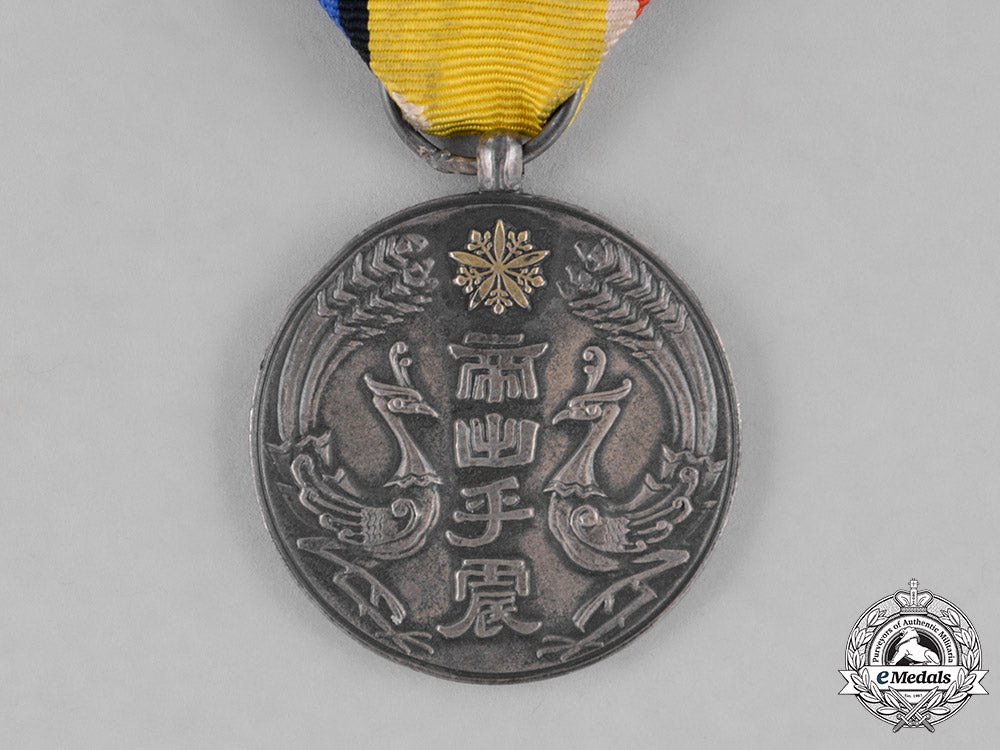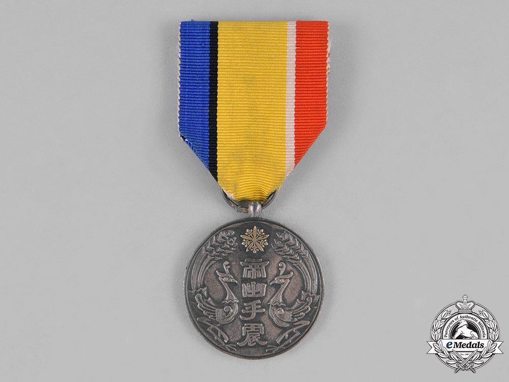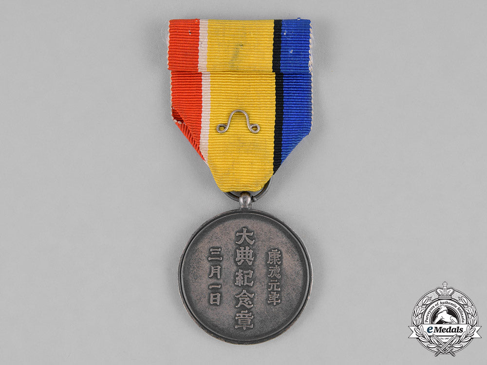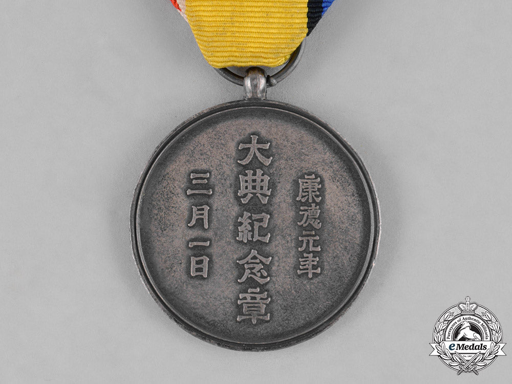 Footnote: Henry Pu Yi, the ""last of the Manchus"", was born in Peking in 1906, the grandnephew of the Empress Dowager and in 1908, at the age of two, was proclaimed Emperor of China under the Imperial name Hussein-Tung. He abdicated on February 12, 1912, at the age of six, after the Chines Revolution, and retired to his palace in the Forbidden City. On July 1, 1917, he was restored to the throne by the warlord Chang Hsun, but was deposed twelve days later. In 1922, he married a Manchu girl, Elizabeth Yuang. IN 1924, they were evicted from the palace by the warlord Feng Yu-hsiang, and took refuge in the Japanese Legation. In 1932, the Japanese took Pu Yi from retirement to become ""Chief of State"" of the new Manchukuo government, and on March 1, 1934, he became Emperor of Manchukuo in ceremonies held at Shuntien Circle at Hsin Hua Tsun, in the suburbs of Hsinking. After eleven years of puppet rule, he was captured by the invading Russians in 1945, imprisoned by the Chinese Communists for fourteen years, and was a zoo-keeper in Peiping before his death. The medal was established by Imperial Edict No. 19 of March 1, 1934, on the day of the enthronement and was awarded to commemorate that event.