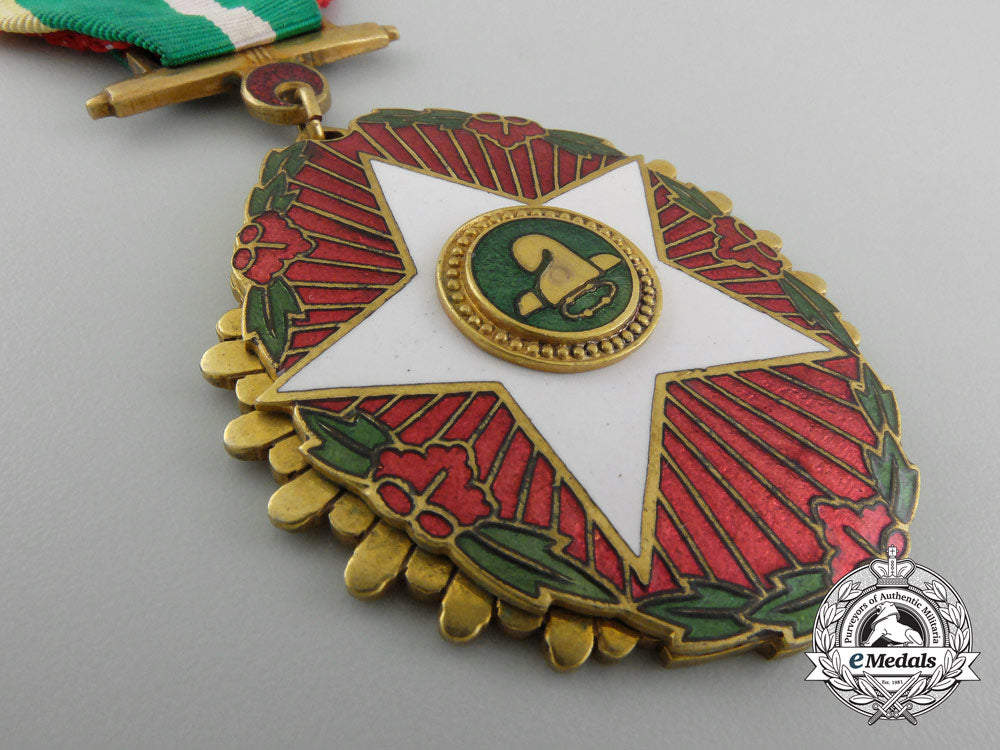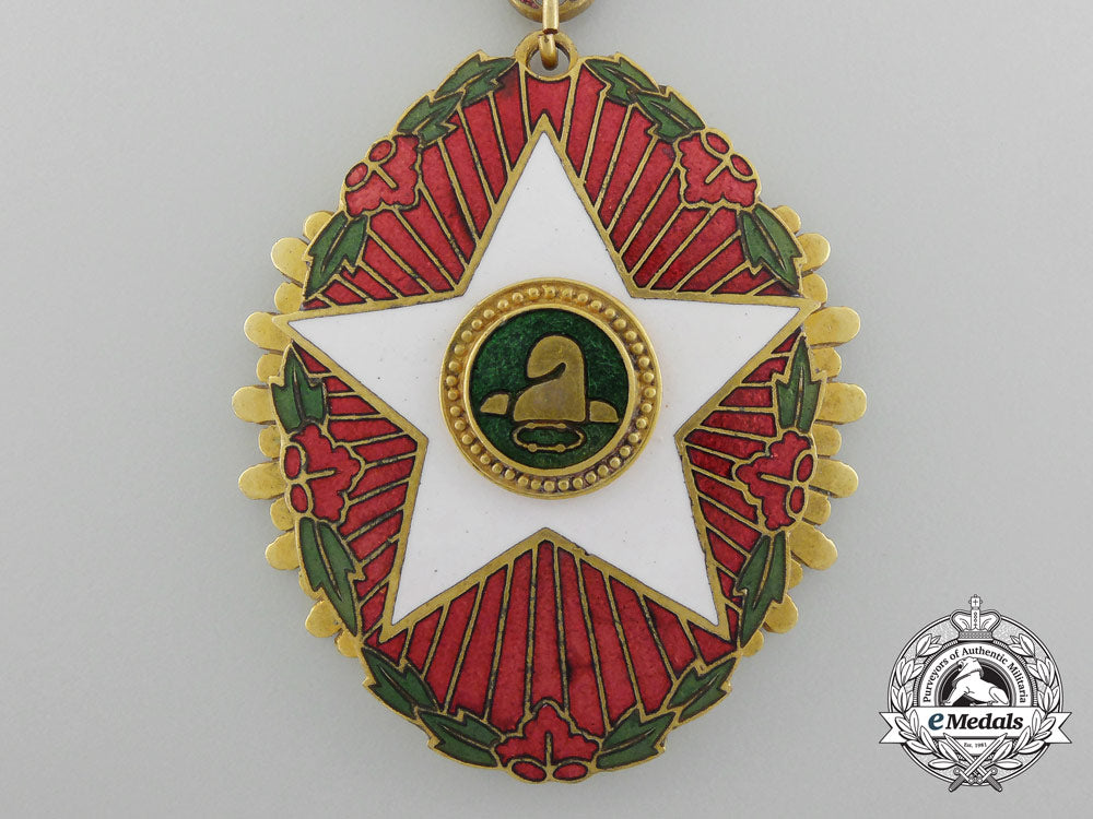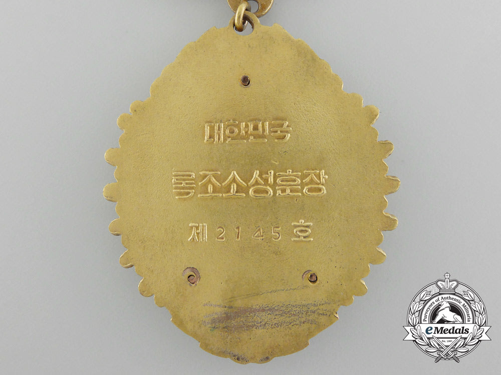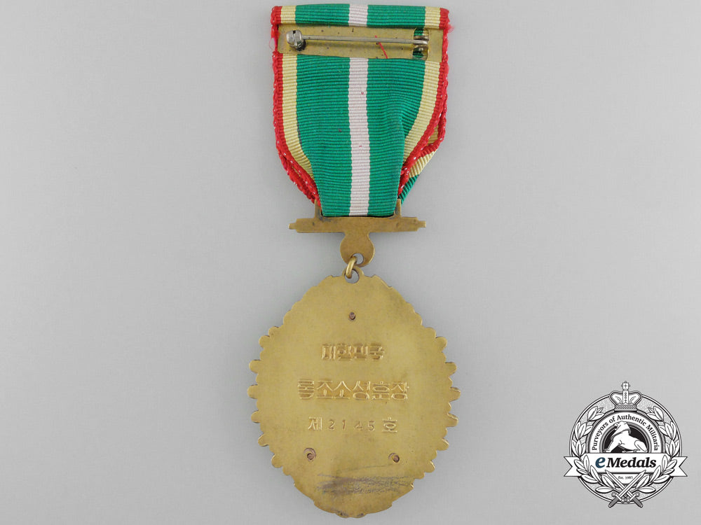 1st Type (1951-1967) (Republic of Korea, South Korea): Three-piece construction, bronze gilt with red, white and green enamels, number impressed "2145" on the reverse, 43.5 mm x 51.5 mm, bar suspension with red enamelled downward-facing crescent moon, original ribbon with pinback, intact enamels, scratches evident on the reverse, very light contact, extremely fine.Footnote: The order was instituted on December 22, 1951 and awarded to civilian employees of the government and the military for outstanding service, in five grades.