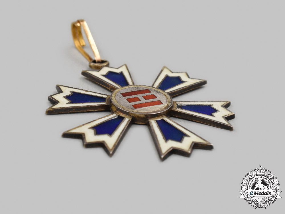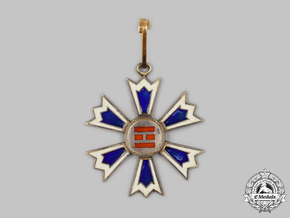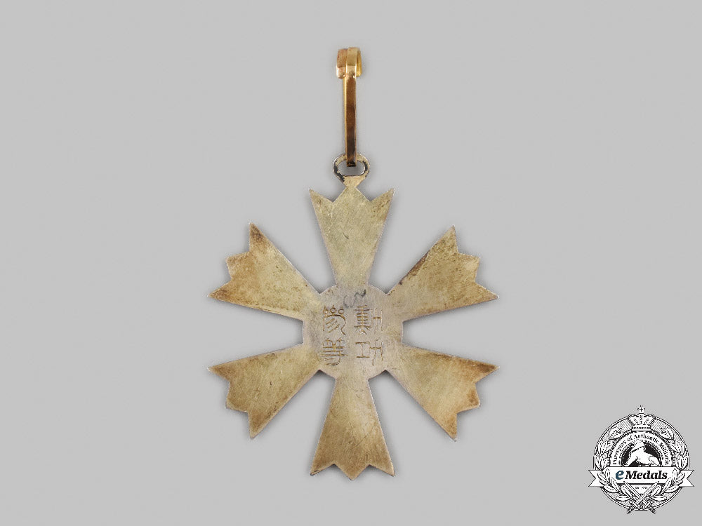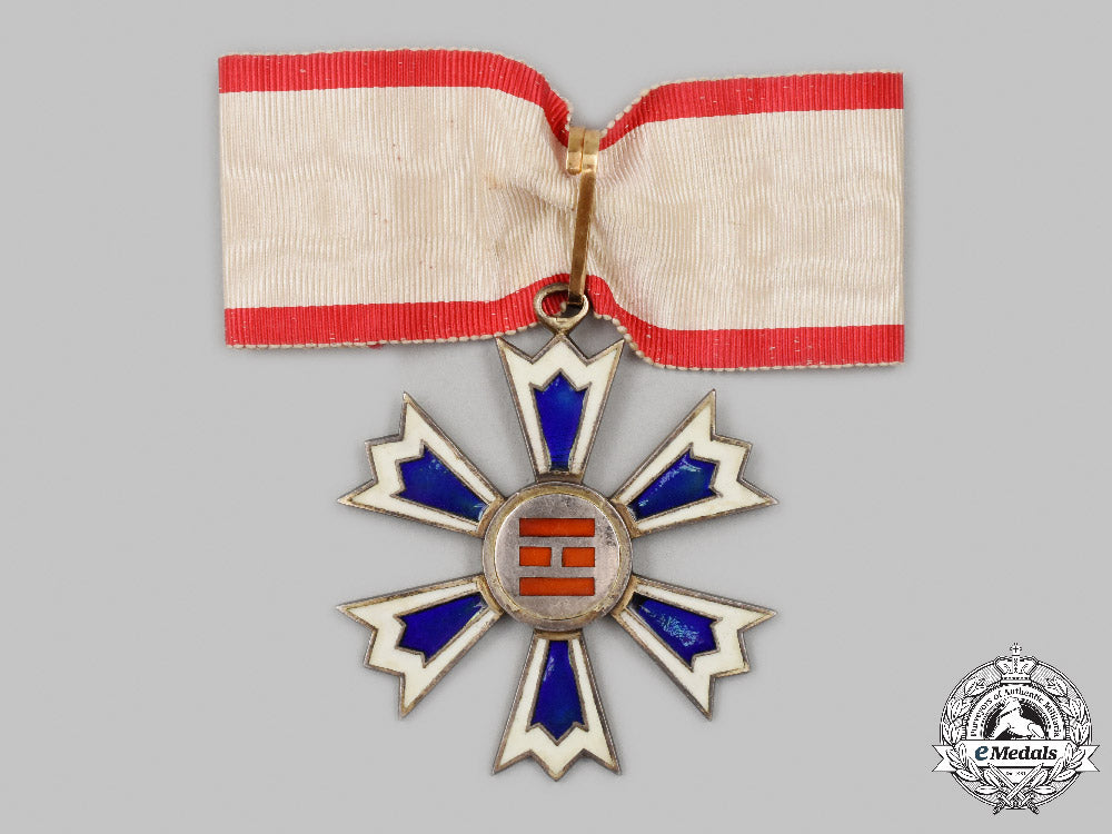 (Palgoe jung). Instituted in 1901. In frosted silver with red, white and blue enamels, obverse centrepiece design of two short bars flanked by long bars top and bottom indicating that it is a III Class award, reverse with kanji inscription, marked "ZZ" on the integral ring, measuring 56.5 mm (w) x 63.5 mm (h) inclusive if its integral ring, loop in Gold, intact enamels, contact marks, minor dent on the edge of the frame of the arm at 10 o'clock, on a shortened original neck ribbon, better than very fine.