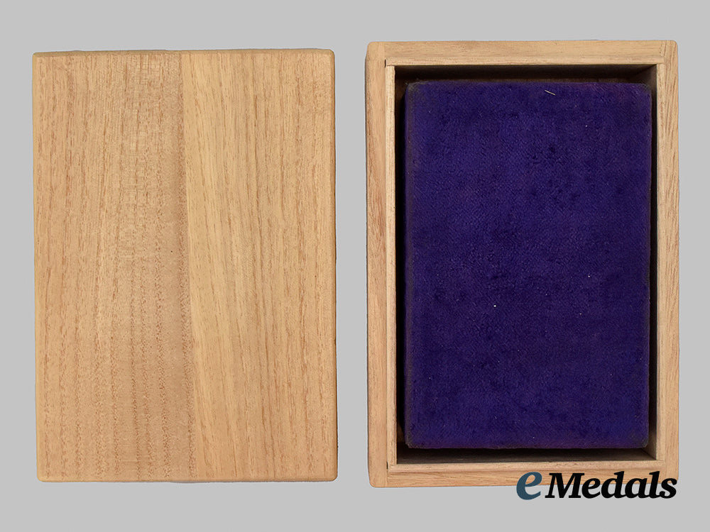The medal is presented in its case of issue, a blue velvet covered box with silk lid interior with Korean characters, the base is a burgundy velvet with recessed medal bed and storage compartment for ribbon. It is accompanied by a bow ribbon lapel pin measuring at 16.4mm on a screwback and an extra suspension. All pieces are contained within a wooden box measuring at 111.5mm (w) x 149.2mm (l) x 48.4mm (h), in extremely fine condition.