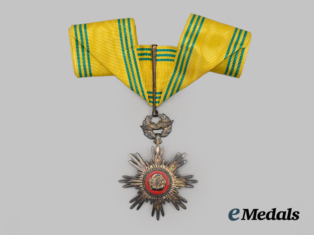 Instituted in 1951. In bronze, an eight-pointed silver gilt star base, each arm with three emanating rays, with two emanating rays between each arm, obverse centre shows magnolia flower imposed on red enamel, on multi-striped original ribbon, inclusive of ornate suspension 68.2 mm (h) x 50 mm (w), very fine condition. In its original case.