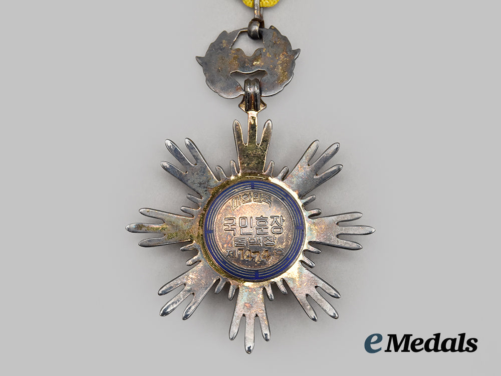 Footnote: The Order was instituted the 22nd of December 1951. It is awarded by the President of South Korea for outstanding meritorious services in the area of politics, economy, society, education, art or science in the interest of improving citizens' welfare and promoting national development.