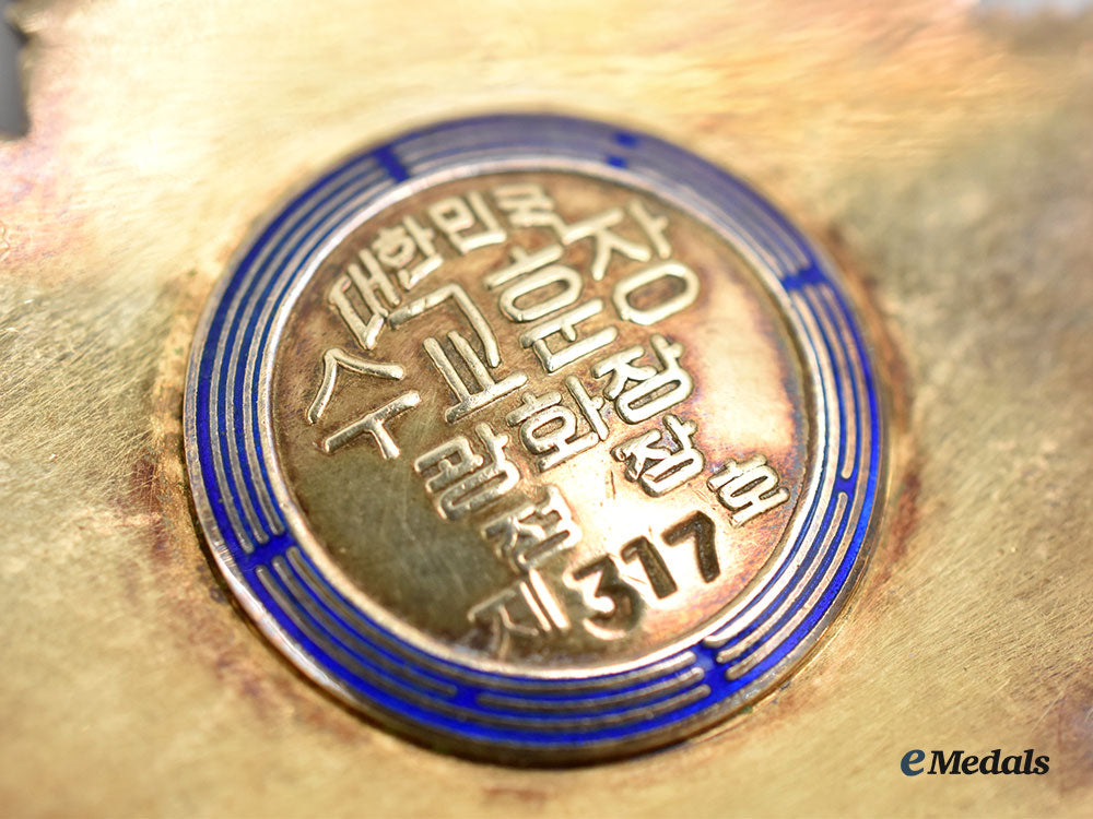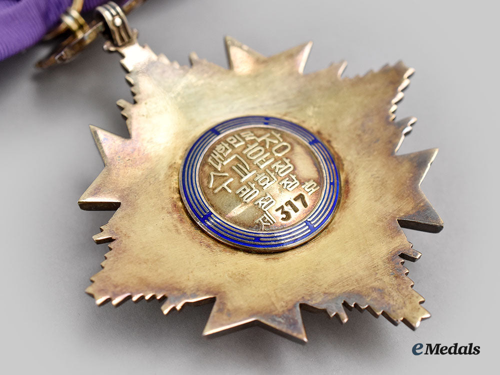 (수교훈장修交勳章). Instituted in 1963. Multi-piece construction, insignia in silver gilt with red, white and blue enamels, along with incorporating four violet glass beads, the insignia mounted to four-pointed star base, each star point with fifteen emanating rays, award number impressed "317" on the reverse cartouche, measuring 61 mm (w) x 82.5 mm (h) inclusive of its crossed feathers and wreath suspension, intact enamels, very light contact, on its original full-length neck ribbon, near extremely fine.