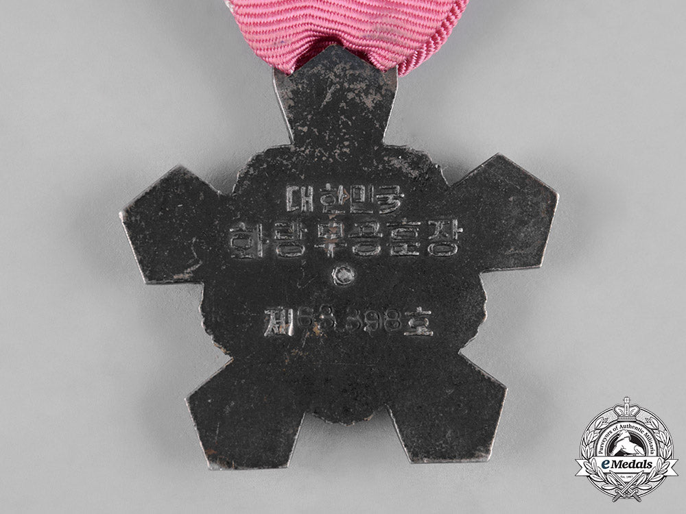 무공훈장武功勳章. Instituted in 1950. (1963-1967 Issue). In bronze gilt with red, white, orange and mid-tone blue enamels, number impressed "63398" on the reverse, measuring 39 mm (w) x 40.5 mm (h) inclusive of its integral suspension, crazing and/on chipping evident in the white enamels on the arms, loose centrepiece, original ribbon with pinback, fine.