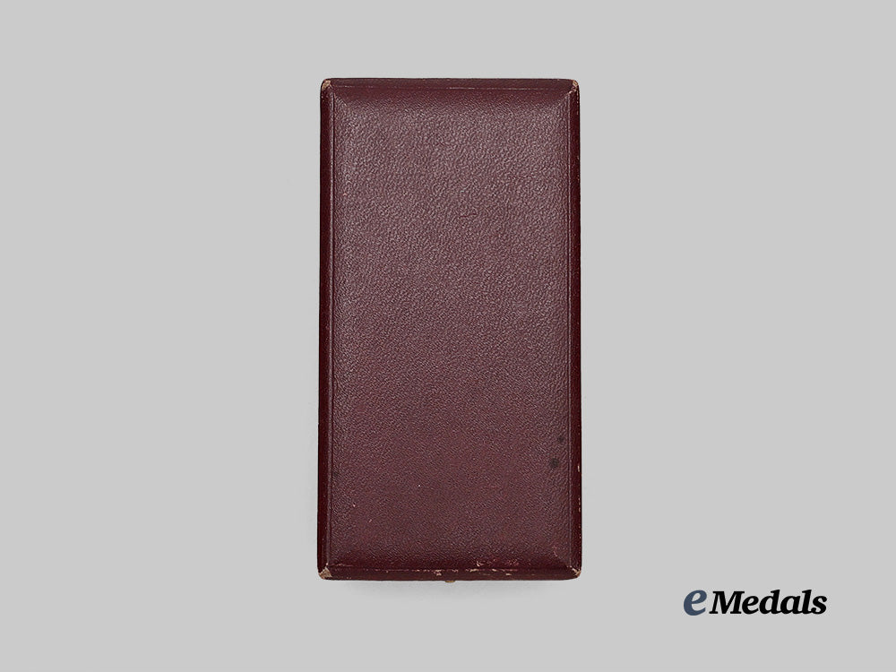 Contained in original case of issue, a burgundy leatherette styled case with creme coloured velvet medalbed, measures 67 mm (w) x 127 mm (h) x 30 mm (d), medal bed is loose and can be removed, scuffing to exterior, better than fine.