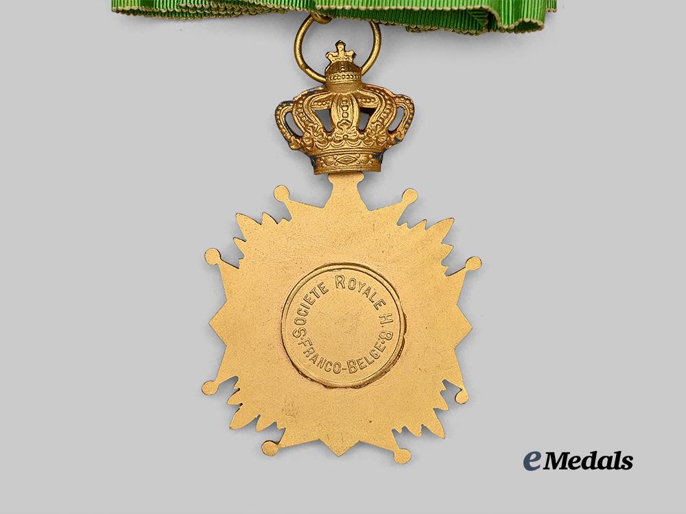 In bronze gilt, a red and white enamelled maltese cross with ball finials and clusters of smooth rays in each quadrant, the obverse medallion featuring a right facing bust, the reverse medallion inscribed SOCIETE ROYALE H B FRANCO BELGE, surmounted by a hollow royal crown, suspended from a full length neck green silk ribbon, measures 48.4 mm (w) x 73 mm (h), gilt wear on crown, enamels intact, very fine.