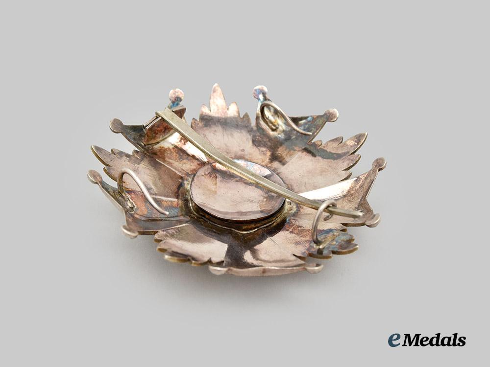 Instituted October 15, 1897. In silver, silver gilt and enamels, presenting a silver five armed Maltese star with ball finials, with five smooth gilt rays in each quadrant, the white and blue insignia superimposed on the obverse, the reverse presents a vertical pin with dual stays, measures 84.3 mm (w) x 83.9 mm (h), cracks and chips in the white enamel, several ball finials bent, in very fine condition.
