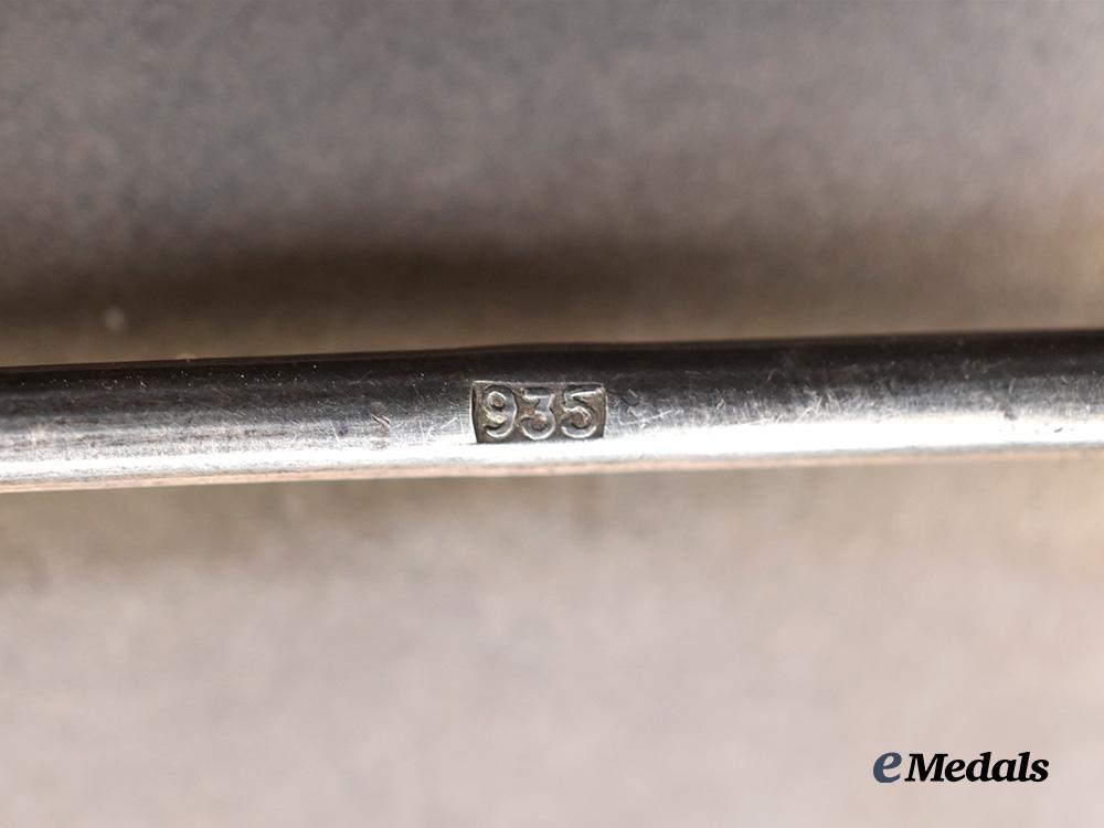 A First War Observer's badge, in silver, hollow center, reverse offers a flat vertical pin with C catch, marked 935 on reverse, measures 42.3 mm (w) x 78 mm (h), weighs 31.67 grams, of superb quality German manufacture, of overall excellent quality and details, and a rare original example, in extremely fine condition.
