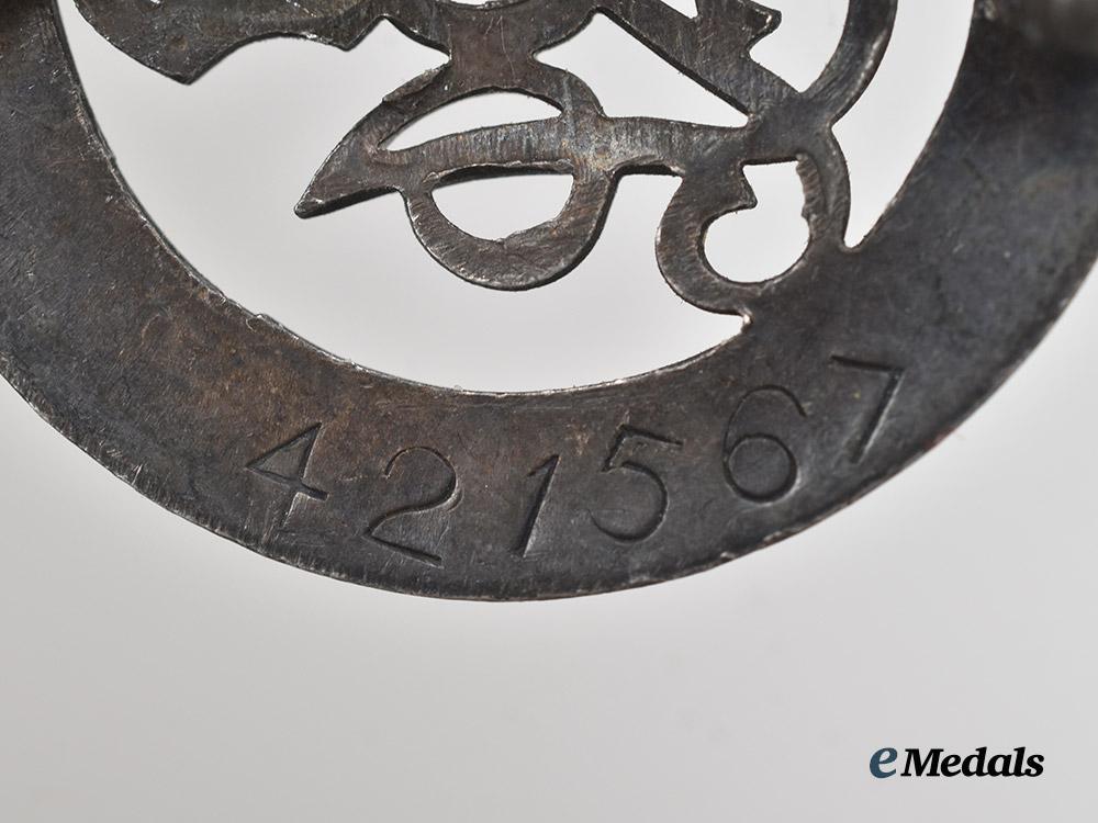 A For Services Rendered Badge, in silver, reverse bears single pin, numbered 421567, measures 33.1 mm (w) x 33.1 mm (h), dark patina, very fine.
