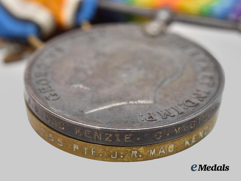 A Victory Medal on a British War Medal Ribbon, in bronze gilt, full size, rim impressed 255 PTE. J.R. MAC KENZIE. C.M.G. BDE., very fine.