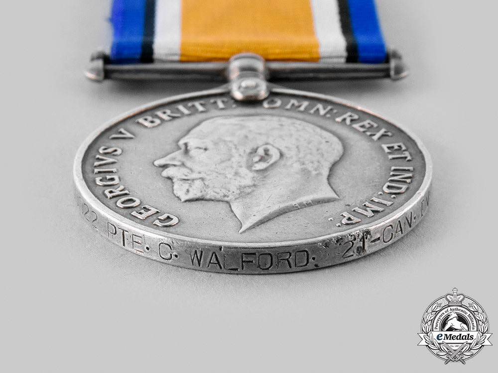 (60022 PTE. C. WALFORD. 21-CAN.INF.). Naming is officially impressed in large capitals. Edge nicks, bruised, contact marks, replacement ribbon, fine. Accompanied by copies of his Index Cards, Attestation Paper, Service Records and Discharged Certificates.