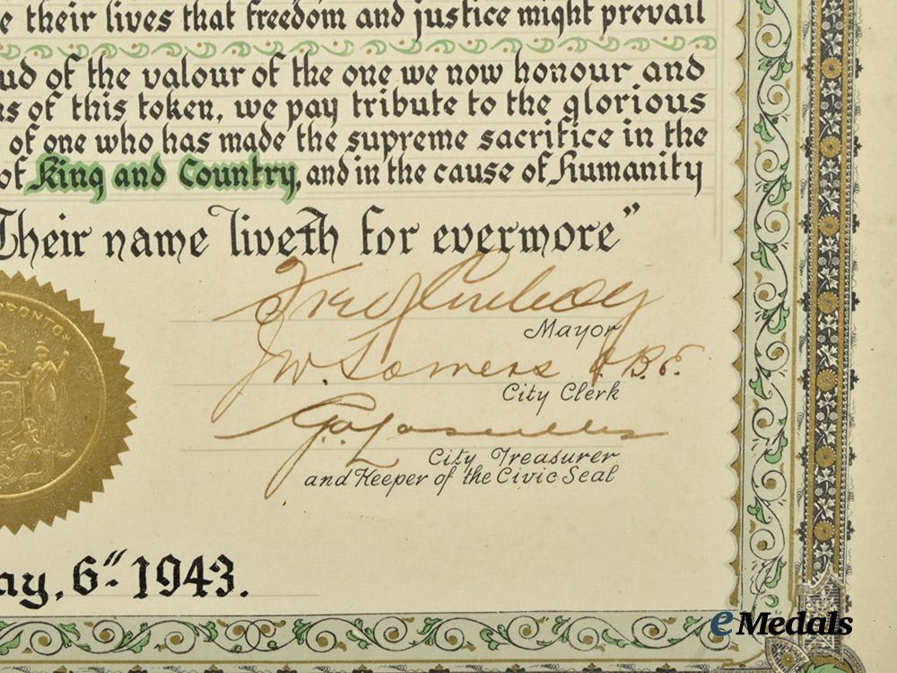 A framed City of Toronto Roll of Honour to Lieutenant Earl Reginald Stoll, Queen’s Own Rifles, Died of Wounds in Boulogne, France. Dated September 20, 1944. Signed by the Mayor, City Clerk and City Treasurer, with city seal. Measures 335 mm (w) x 438 mm (h) x 15 mm (d), reverse offers a horizontal hanging wire, with copies of the Second War Memorial Remembrance Book entrance for Lieut. Stoll and cemetery details, light wear and contact marks to frame, foxing to paper below the glass, remains very fine.