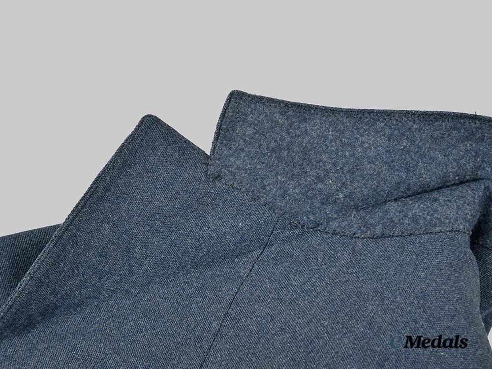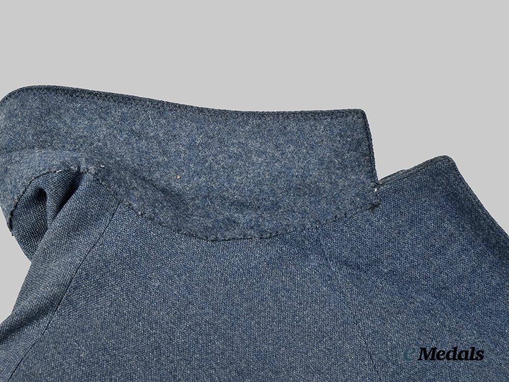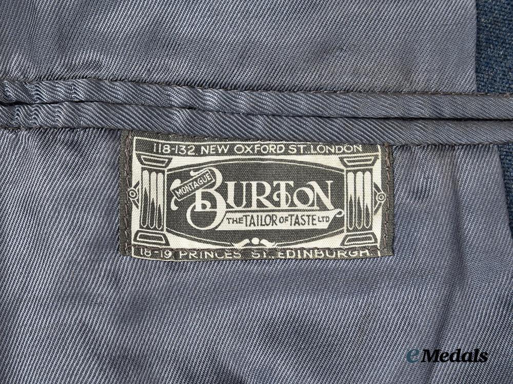 A lovely RCAF tunic of the second war in blue wool, single breasted with open drop fall collar. There are two breast pockets, each scalloped flap is closed with a single brass R.C.A.F button (additional snap closures on each corner of the flap) and two larger lower pockets with straight flaps, also closed by brass buttons. Each side of the tunic is secured closed by four large brass R.C.A.F buttons, with a thick belt with brass closure around the mid waist. Above the left breast pocket sits an embroidered WAG wing in multicoloured threads. Each of the sleeve shoulders bear a CANADA embroidered shoulder title, the cuffs are purposely designed without buttons and have Flying Officer rank stripes sewn upon them. The inside of the tunic comes with a blue rayon lining, while the sleeves are lined in light creme coloured rayon. There is a pocket on the right side of the chest which also bears the manufacturers label denoting “MONTAGUE BURTON” of New Oxford st. London and Princes St, Edinburg. The tunic measures 46 cm across the shoulders, 65 cm sleeve length, and 79 cm in total length, exhibiting light soiling to the interior lining, otherwise very minimal wear to the exterior, a tunic in extremely fine condition.