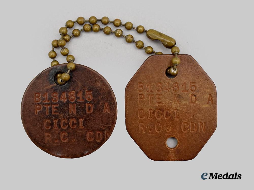 3. A pair of Canadian Army dog tags attached to each other by a chain. Dog tags read "B134815 PTE N D A CICCI R.C. CDN".