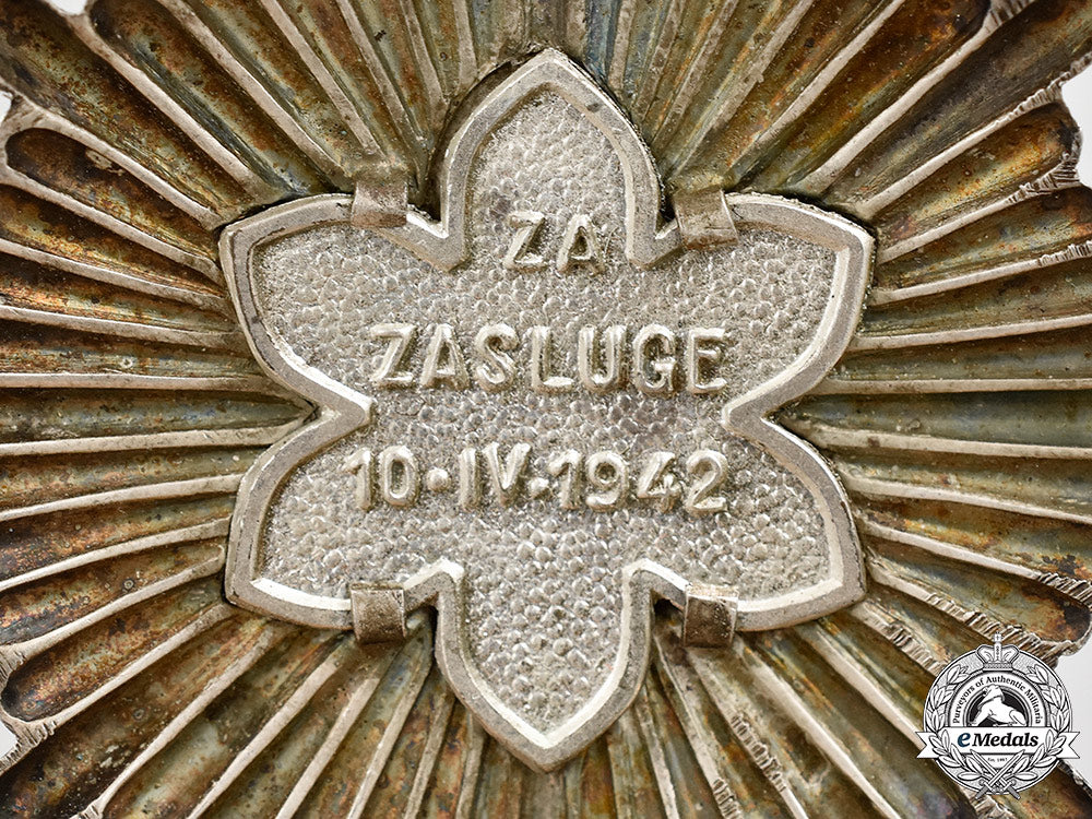 (Red za zasluge). Instituted in 1942. In silver with red enamels, mounted to a frosted silver star base, maker marked "BK" (Braća Knaus, Zagreb) and hallmarked with a lobster flanked by the Roman numeral "III" and a "1" on the pin, measuring 74.5 mm (w) x 75.3 mm (h), vertical pinback, intact enamels, extremely fine.