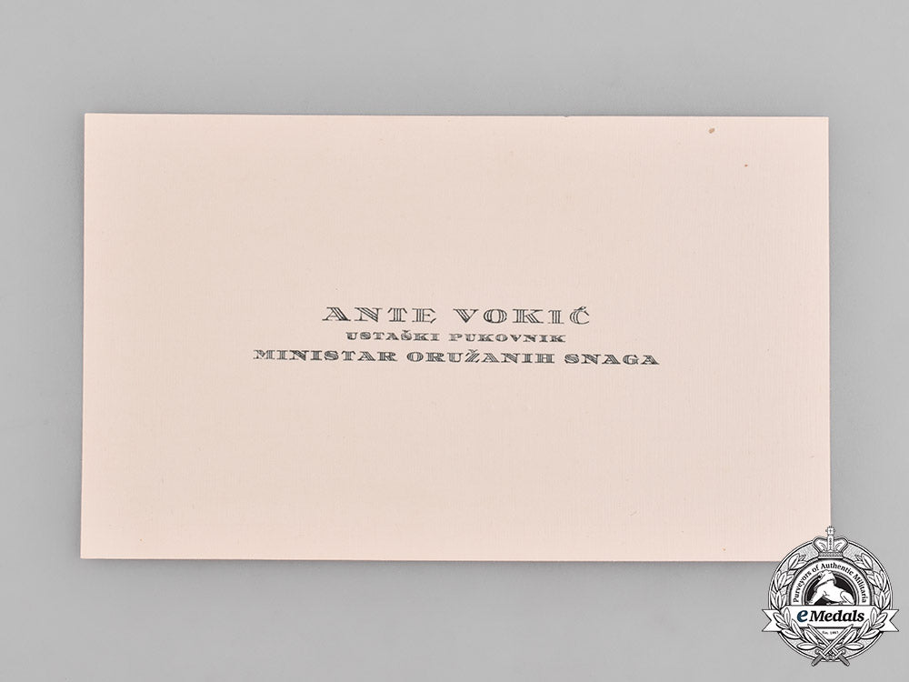 Card measures 10cm x 6cm, in used condition. Ante Vokić (23 August 1909 – 8 May 1945) was a Croatian/Ustaše politician, general and putschist. He was the Minister of Armed Forces of the Independent State of Croatia from 29 January to 30 August 1944.