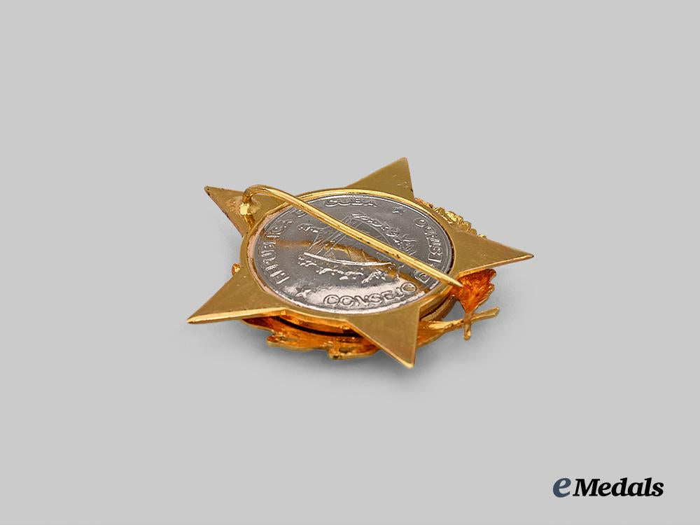 (Orden Antonio Maceo), four-piece construction, 43,7 mm in diameter, weighing 25,9 grams, silvered and gilt metal with dark blue enamel centre ring inscribed “Antonio Maceo” surrounding a finely detailed gilt portrait of the General, slight staining of gilding visible on the upper star prong at 12 o’clock, reverse displaying the Cuban national coat of arms circumscribed “Republica de Cuba / Consejo de Estado,” fitted with a horizontal pinback device, accompanied by its corresponding ribbon bar, overall very fine.