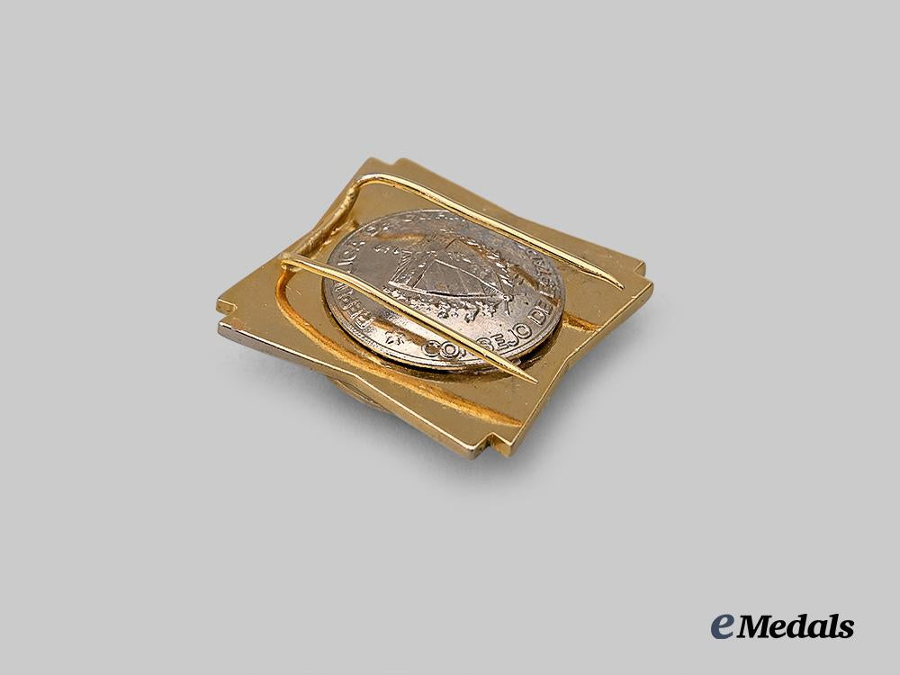 (Orden Camilo Cienfuegos), Three-piece construction, 33,7 mm wide and 33,8 mm high, weighing 30,7 grams, silvered and gilt metal with green enamel ring inscribed “Camilo Cienfuegos,” featuring a finely detailed portrait of the revolutionary commander at centre, reverse displaying the Cuban national coat of arms circumscribed “Republica de Cuba / Consejo de Estado,” fitted with a horizontal pinback, accompanied by its corresponding ribbon bar showing cracking to the yellow section, slight discolouration in the gilding, overall very fine.