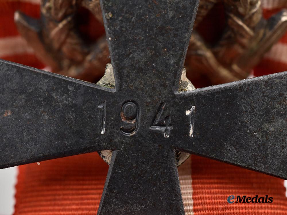 (Vapaudenristin ritarikunta). In silvered and blackened iron, magnetic, dated "1941" on the reverse, measuring 38.5 mm (w) x 66 mm (h) inclusive of its silvered non-magnetic trophy of arms suspension, some discolouration on suspension, scattered blackening wear evident on front, on its original military ribbon, ribbon show its age, overall fine.