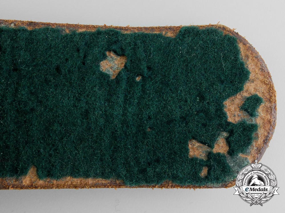 Single prong open-claw buckle in magnetic steel with a brown painted finish on the right end, unmarked, the buckle measuring 40.8 mm x 57.5 mm. Belt with a smooth finished brown upper, with a green felt underside, unmarked, belt passes through the bar of the buckle, finishing on the reverse and is stitched in place, six rows of two holes each for length adjustment on the left end, belt with two sliders that have matching uppers, the wider slider with a D-ring stitched in place at the bottom, the belt measuring 44 mm x 1,070 mm. Buckle exhibiting brown paint loss on the prong where it contacts the roll bar and belt, light crazing on the belt's upper, extensive mothing evident on the felt underside. Better than very fine.