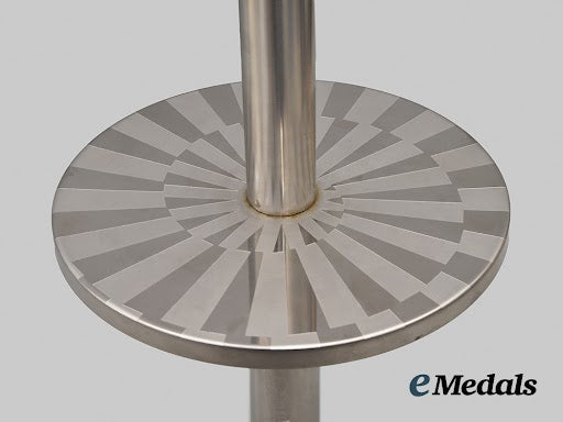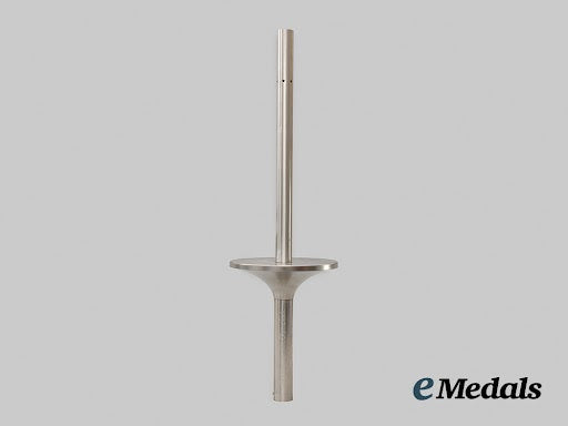 (Fackel der Olympischen Spiele in München 1972). A rare and exceptionally well-preserved 1972 Munich Summer Olympics torch, of multi-piece assembly and constructed of nickel-plated non-magnetic metal steel, featuring a handle bearing engraved inscriptions of “SPIELE DER XX. OLYMPIADE” and “MÜNCHEN 1972” flanked by Olympic rings, culminating in a screw-on cap bearing a maker’s mark of “KRUPP” for the famous Essen-based steel manufacturer, topped by the firm’s three ring logo, topped by a flat base finished on the obverse with a geometric design symbolizing the heavens, with a combustion tube emanating from the centre and perforated near the tip with six holes to maintain a flame, measuring 75 cm total length, a superb original example in extremely fine condition.