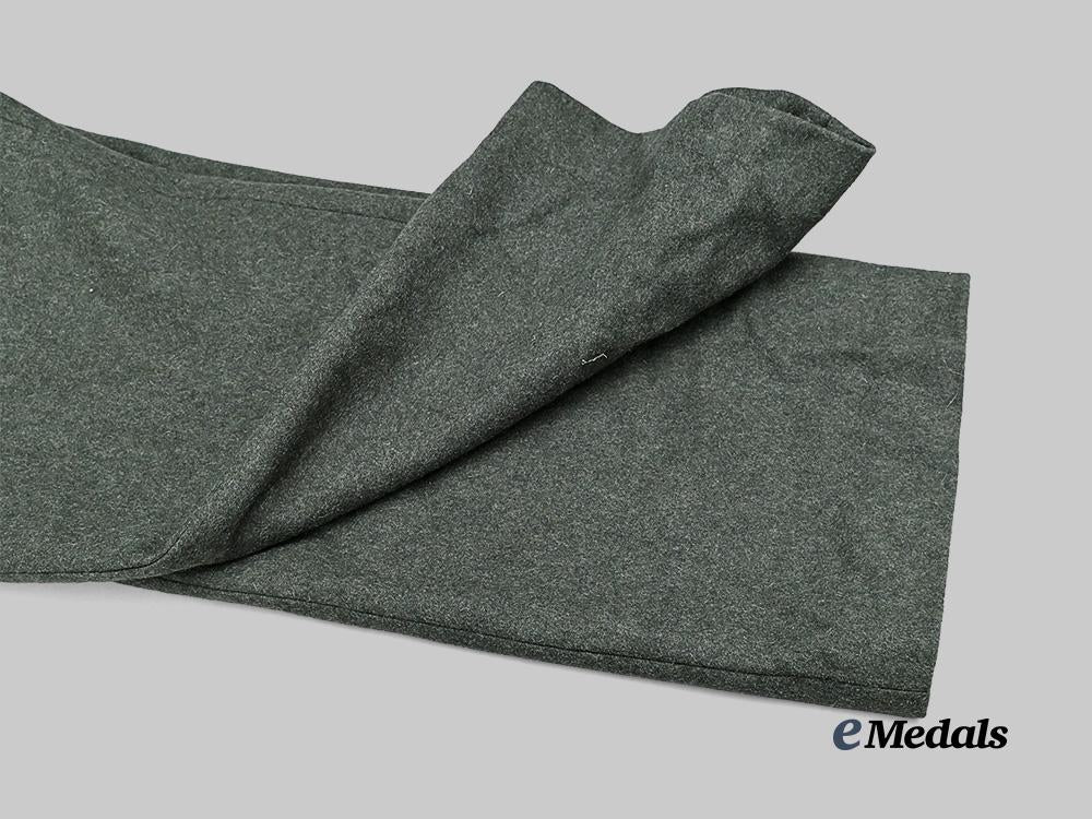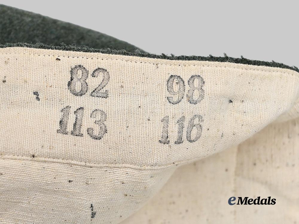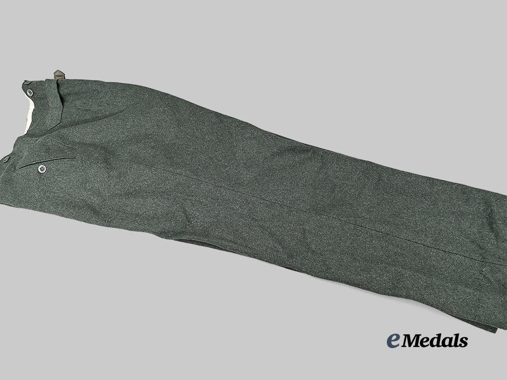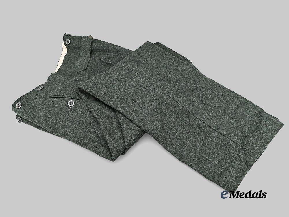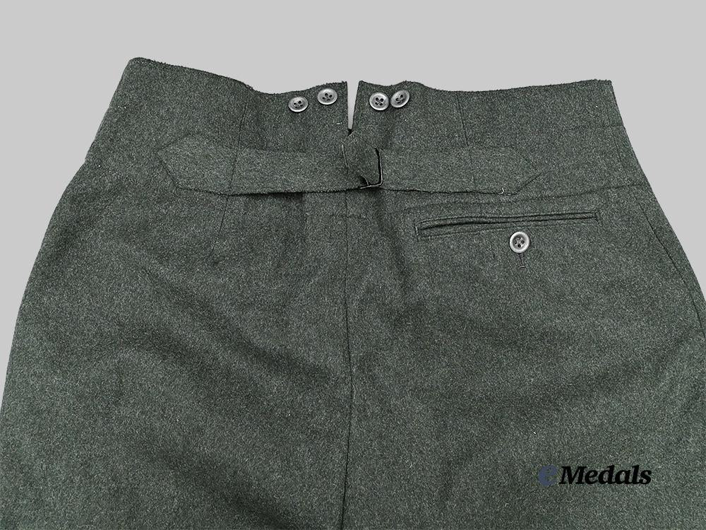 (Heer Tuchhose M40). An exceptionally well-preserved pair of Heer M40 trousers, constructed of field-grey wool. Eight feinzink buttons are distributed around the waistband, while a French fly closes with five hidden buttons of identical construction. A single front pocket is set into the upper left leg and opens with a button and vertical slash, while a single back pocket is set into the upper right and opens with a horizontal slash and button. Two integral straps set into the back fasten closed with a functional metal buckle. The interior features a partial white cotton liner set throughout the waist, which also provides the interior compartments for the pockets. Size marks are stamped onto the right side of the waist in black ink. Otherwise unmarked, the trousers measure approximately 44 cm across the waist, with an inseam of 34 cm, and an overall length of 106 cm when folded on a flat surface. Demonstrating no evident damage or wear, these early wartime trousers remain in a near mint condition.