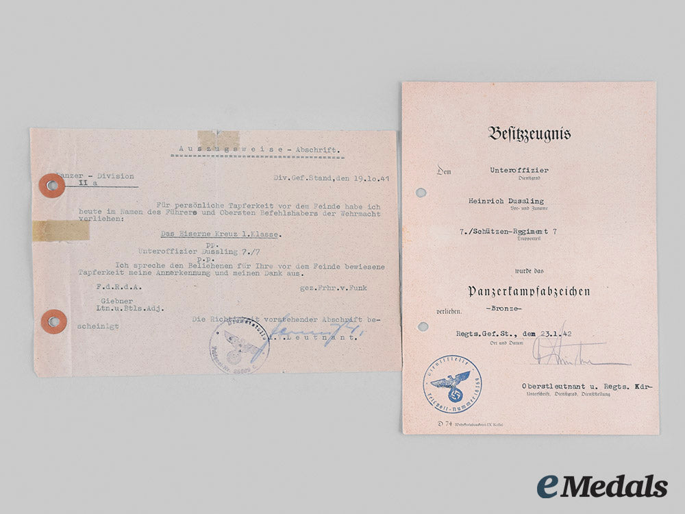 Germany, Heer. A Pair Of Award Documents, Schützen-Regiment (Rifle Regiment) 7