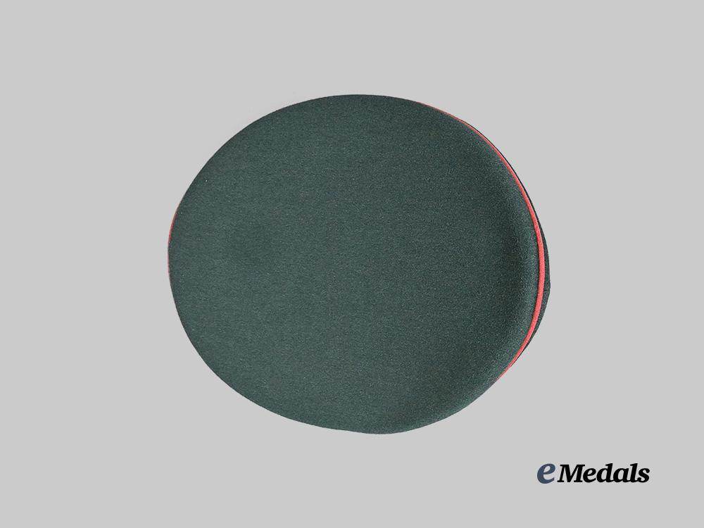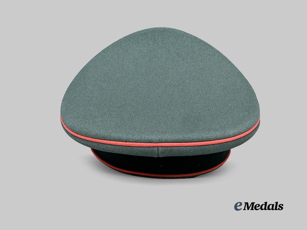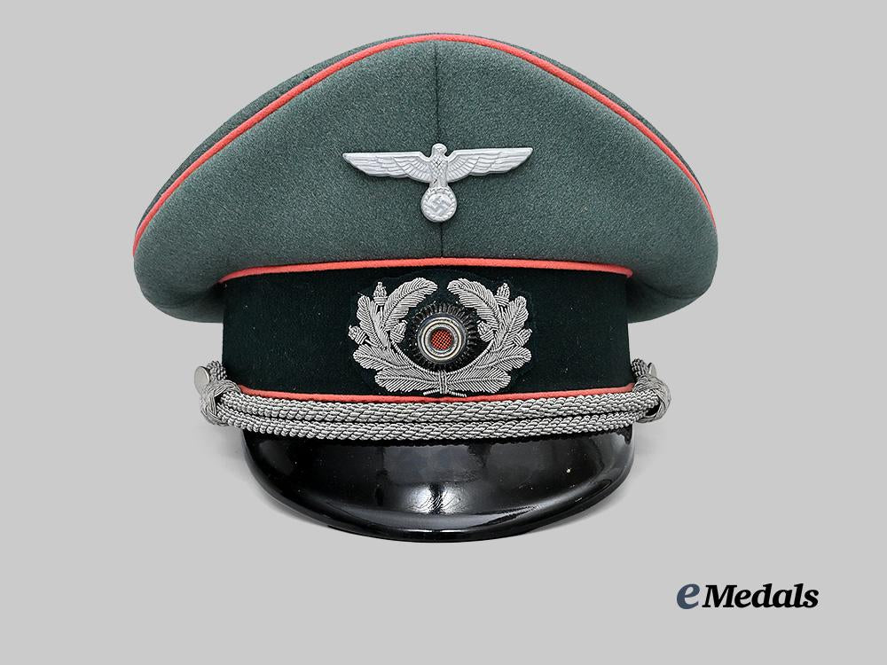 (Heer Schirmmütze für Offiziere der Panzertruppe). An extremely well-preserved Heer Panzer Troops Officer’s visor cap, constructed of field-grey whipcord wool. It features reinforced side walls which are fully lined on the exterior with a dark green wool cap band. Both the top and bottom edges of the band are trimmed with rose-pink piping, while an additional length of identical piping surrounds the outer edge of the crown. Pinned onto the peak of the cap is an aluminum insignia consisting of a Wehrmacht eagle clutching a wreathed mobile swastika, measuring 65 mm (w) x 25 mm (h). Directly below the eagle, the centre of the cap band features an additional insignia consisting of a padded dark green wool base bearing a hand-embroidered silver aluminum wire oak leaf wreath surrounding a tri-colour cockade. The lower edge of the cap band is flanked on each side by pebbled aluminum studs which accommodate a chinstrap constructed of multiple rows of twisted and rolled silver aluminum wire. A protruding vulcanfibre visor completes the exterior features, and is finished in black on the obverse and light brown on the reverse. A multi-piece beige rayon liner encompasses the interior, while a wide light brown sweatband surrounds the side walls and is perforated with ventilation holes through the forehead. Stitched onto the crown is a transparent plastic moisture guard which bears the “SONDERKLASSE” maker’s mark of EREL (the former firm of Robert Lubstein, Berlin”, along with a distributor mark of “MILITÄRWARENHAUS HANS DÜBECK, WIEN IX. BERGGASSE 31”. An additional silvered EREL mark is visible on the right side of the sweatband. Inserted into the guard’s slot is a paper label bearing a typewritten owner’s name of “MAJOR HANS V. KRISCHER-WEHREGG”. The cap measures approximately 23 cm (w) x 27 cm (l) x 17 cm (h). Minor soiling consistent with wartime wear is visible to the interior, but this owner-attributed cap remains in an extremely fine condition.