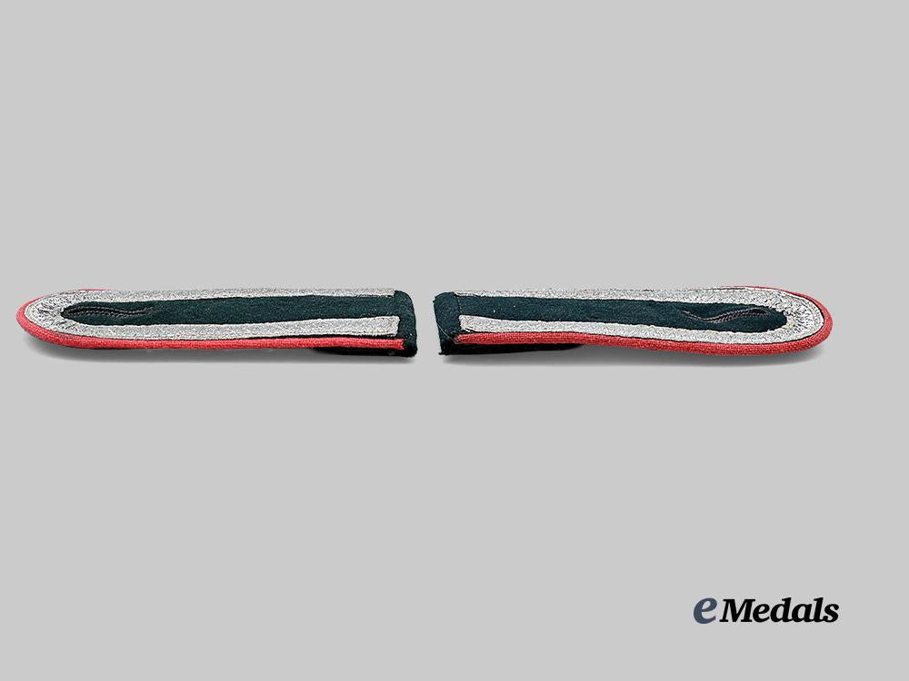 2. A pair of shoulder straps, each constructed of dark green wool with field-grey wool underlays, trimmed with rose-pink piping, and bordered by silver aluminum wire tresses, the reverse of each retaining an integral strap perforated with a reinforced buttonhole, both unmarked and measuring 45 mm (w) x 105 mm (l), in uniform-removed and extremely fine condition.