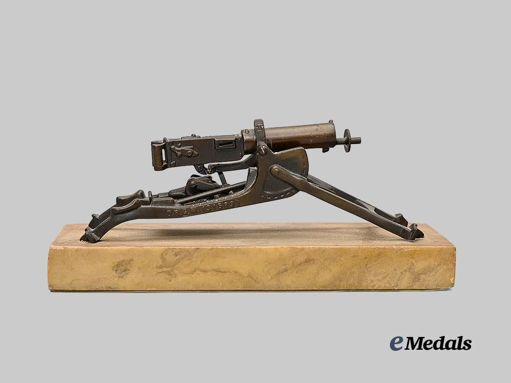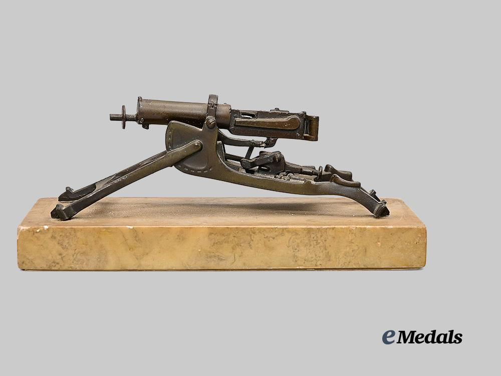 (Schreibtischdekoration Maschinengewehr 08). An MG 08 desk ornament, consisting of a scale replica of the primary heavy machine gun utilized by German forces during the First World War (with additional limited pre-war and post-war service), executed in olive-drab painted bronze, featuring swivel action within the carriage, affixed to a marbled pedestal which retains a paper liner on the base to mitigate surface scratching, unmarked, measuring 7 cm (w) x 17.5 cm (l) x 7.5 cm (H0, demonstrating minor chipping to the edges of the base, a patriotic ornament in near extremely fine condition.
