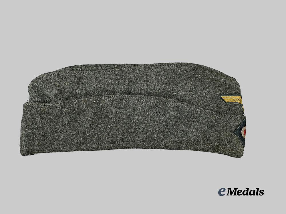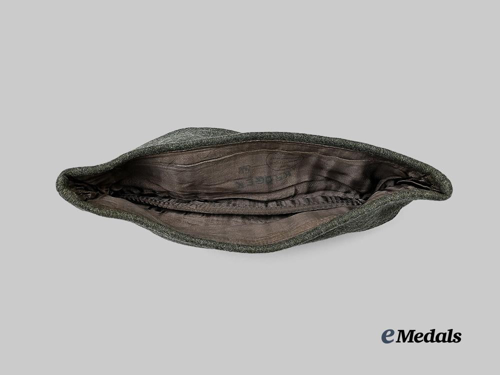 (Kriegsmarine feldgraues Schiffchen für Mannschaften der Küstenartillerie). An extremely well-preserved Kriegsmarine Coastal Artillery overseas cap, constructed of field-grey wool. The cap is fully surrounded by fold-down side walls with a subtle downward slope toward the front. Stitched onto the peak is an insignia consisting of a field-grey rayon backer bearing a machine-embroidered golden-yellow Kriegsmarine eagle clutching a wreathed mobile swastika, measuring 65 mm (w) x 25 mm (h). Directly below the eagle, the centre also features an insignia in the form of a field-grey rayon backer bearing a machine-embroidered tricolour cockade, measuring 40 mm (w) x 40 mm (h). A multi-piece slate-grey rayon liner fuller encompasses the interior, and is stamped with the logo of Société Chapelière Parisienne, indicating manufacture by a firm associated with a consortium of Paris-based hatmakers, along with a size mark of “58”, and a handwritten owner’s name of “KRÖGER”. The cap measures approximately 28.5 cm (w) x 12 cm (h) when folded on a flat surface. Demonstrating only minor to the base material consistent with age and field wear, this untouched, French-made cap remains in an extremely fine condition.